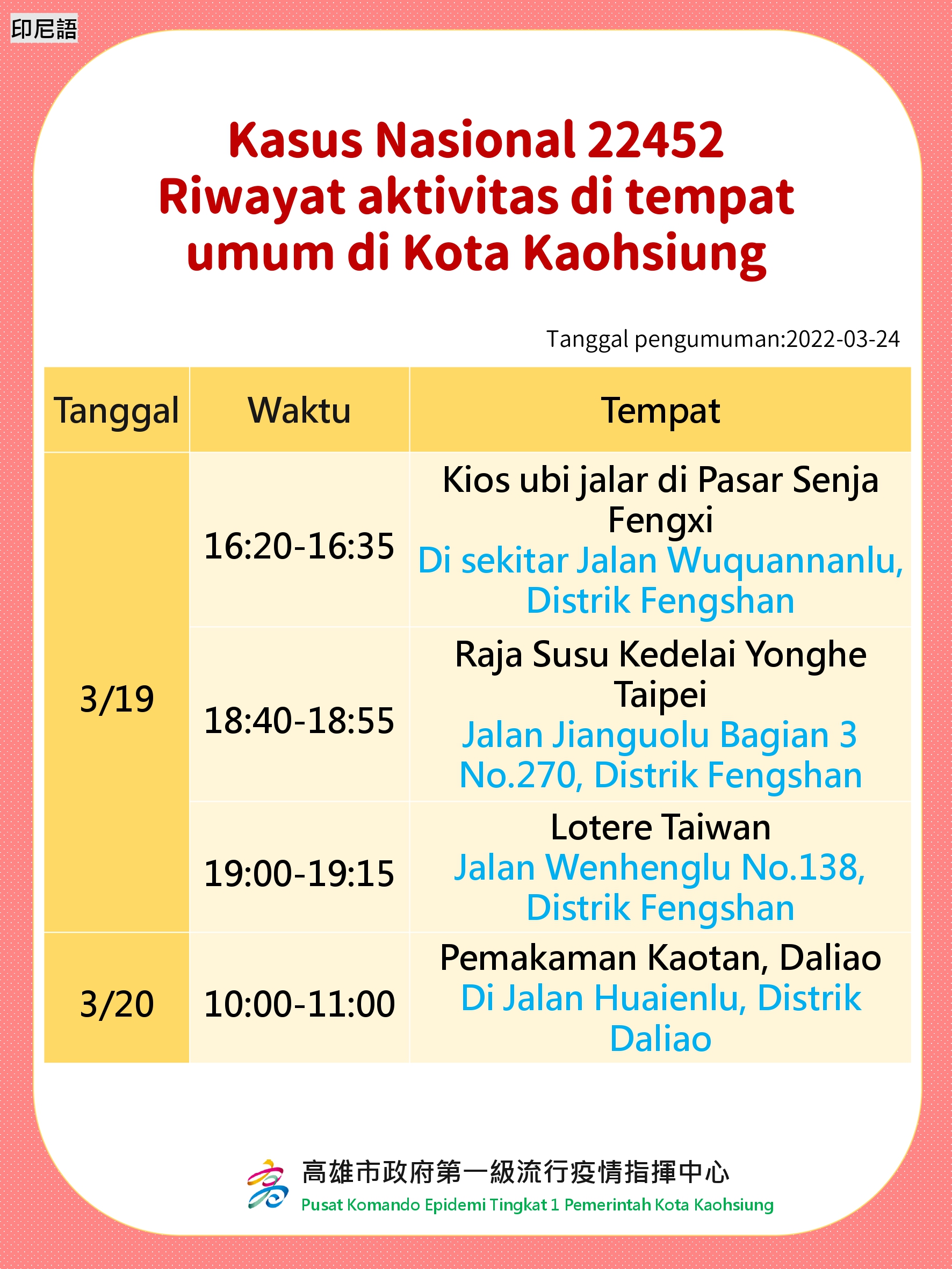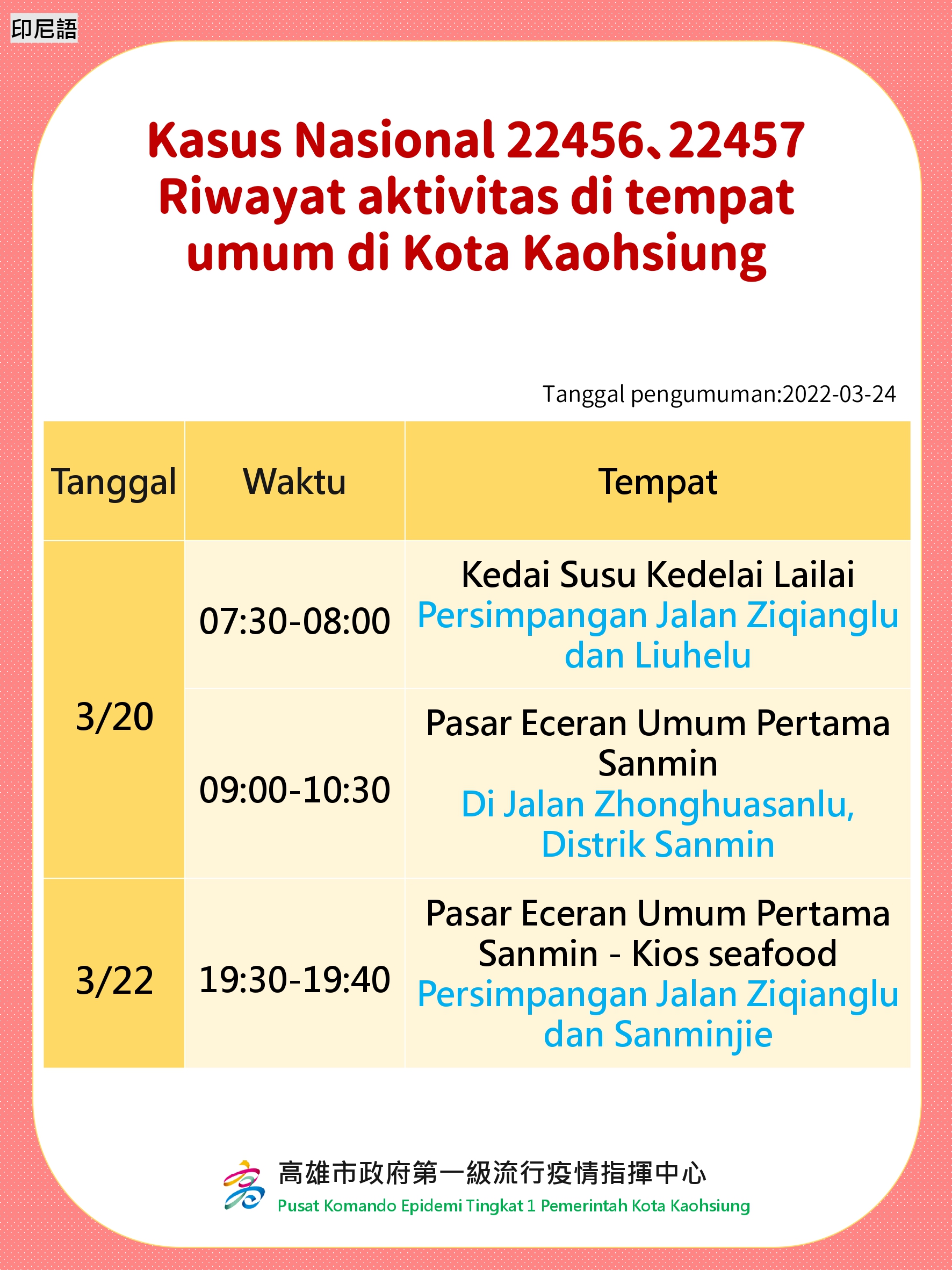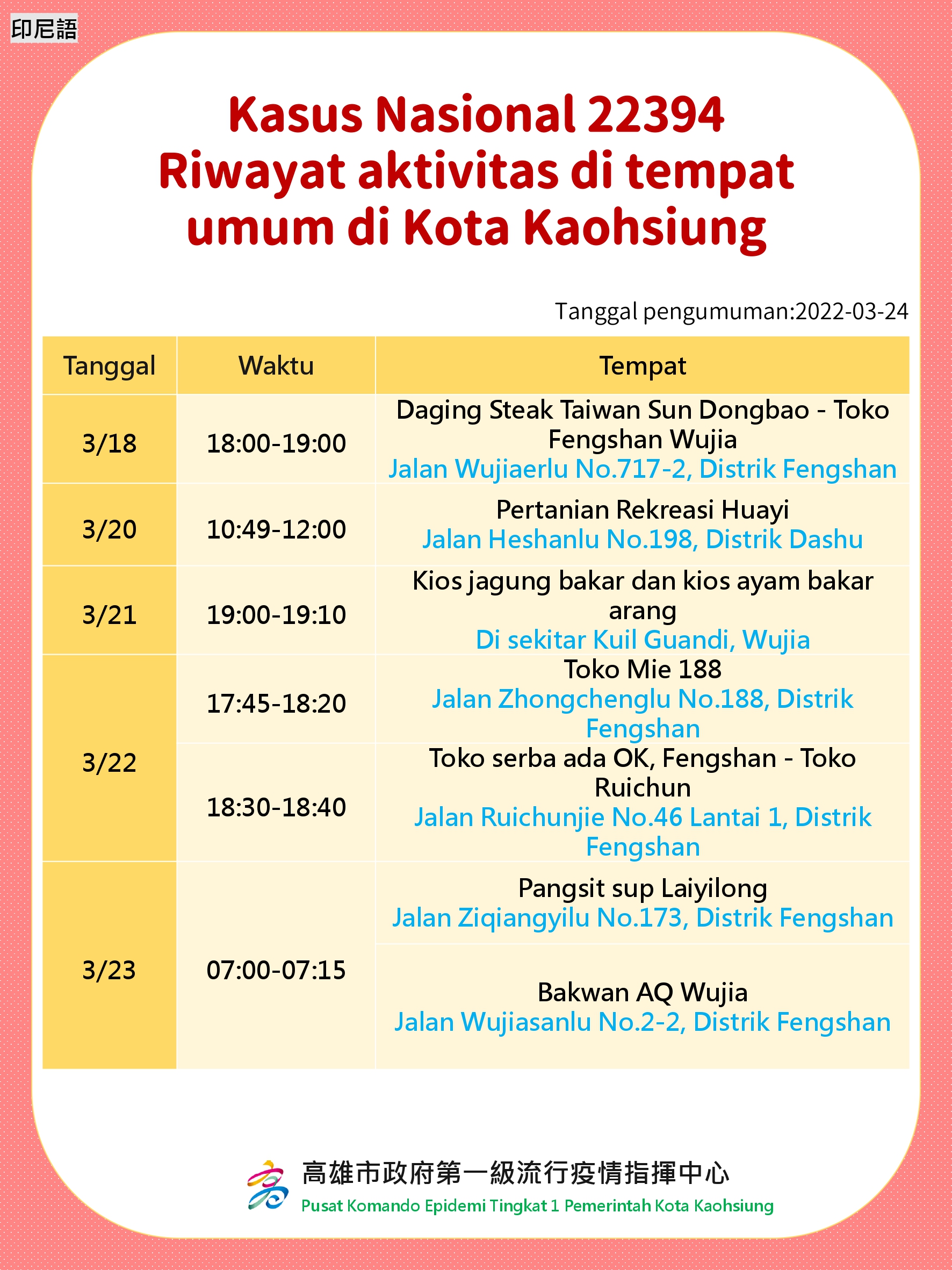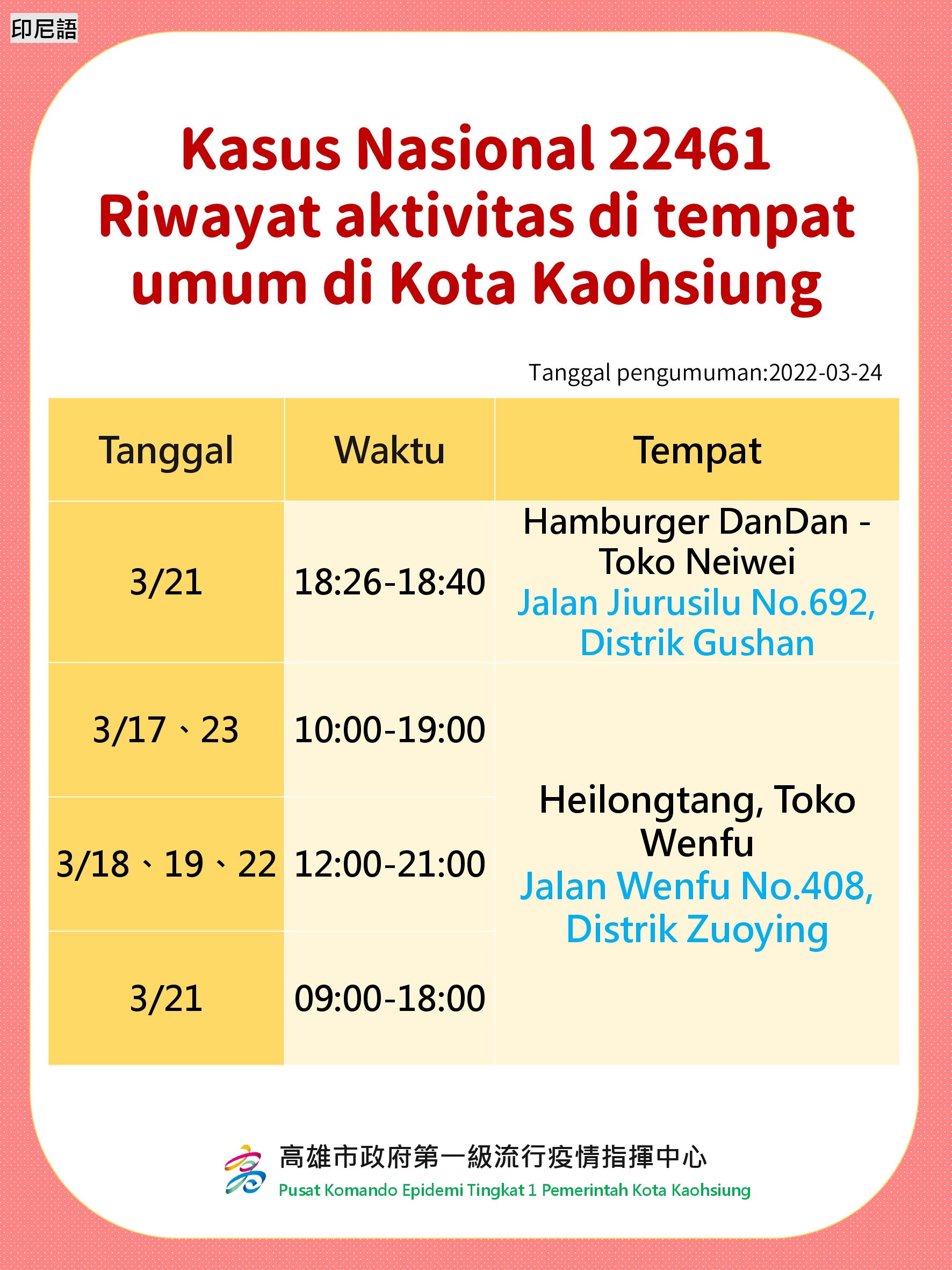 活動訊息:Rekam Jejak Kasus di Tempat Umum Kota Kaohsiung. Tanggal Diumumkan: 24 Maret 2022
