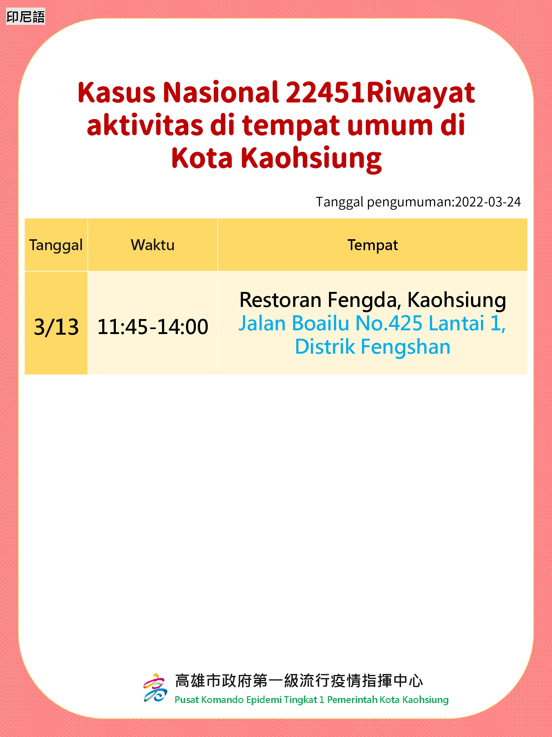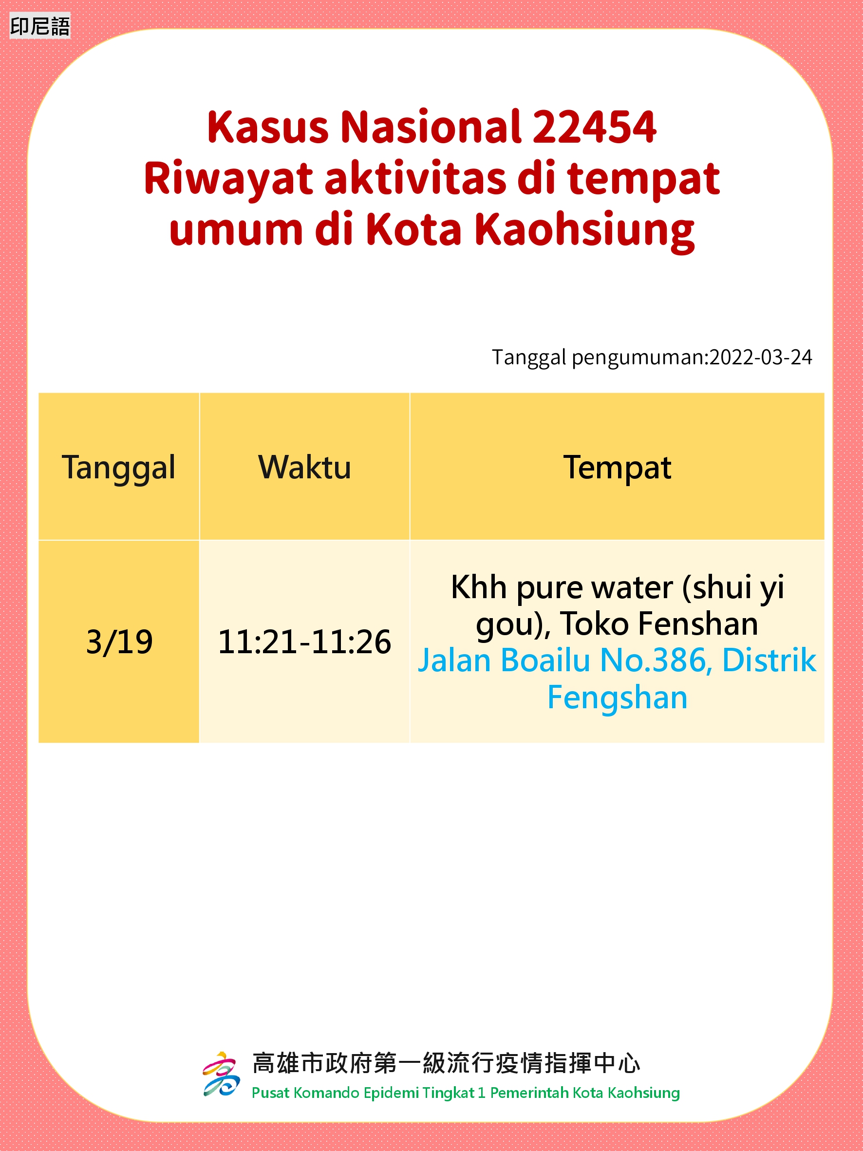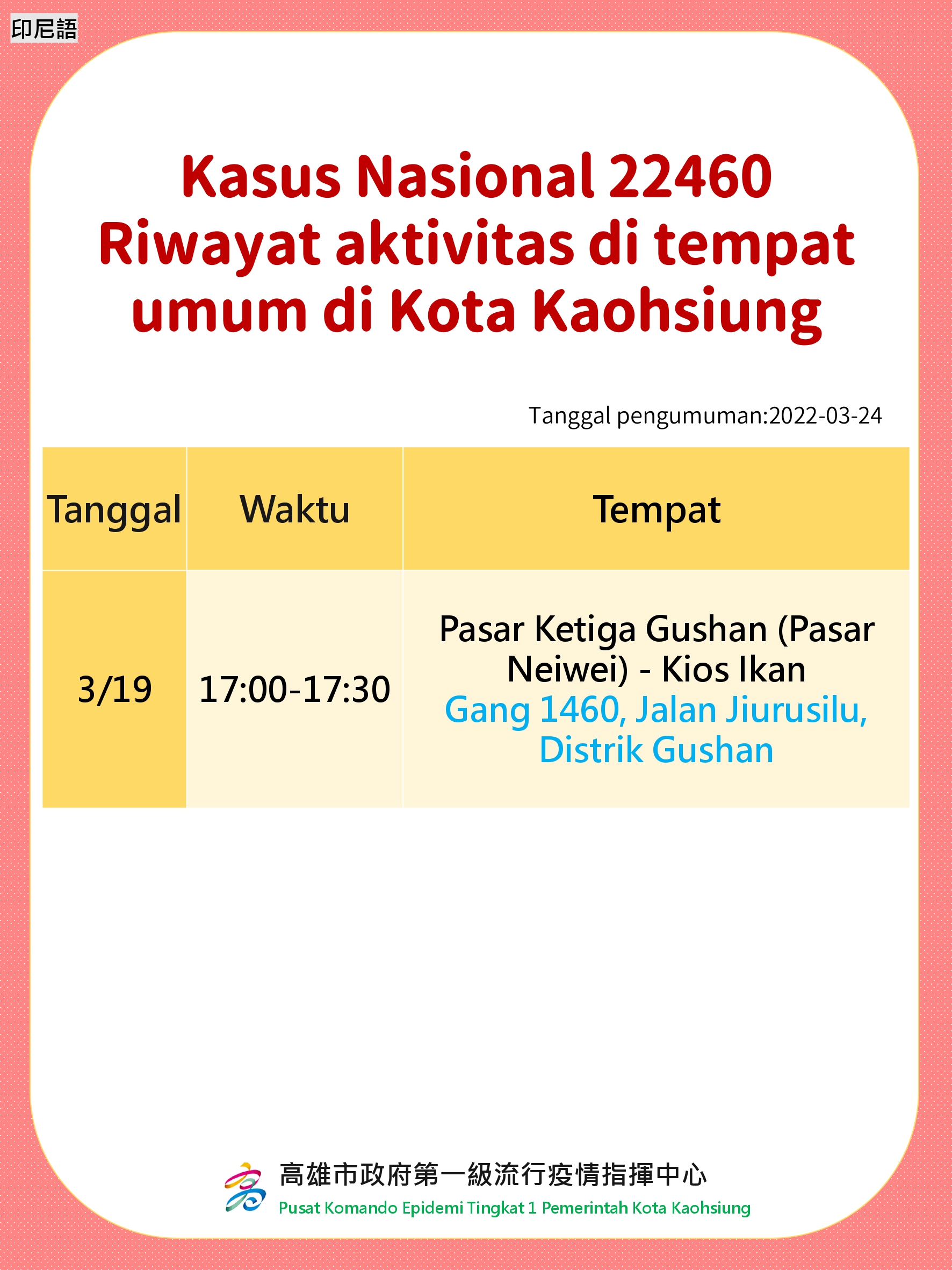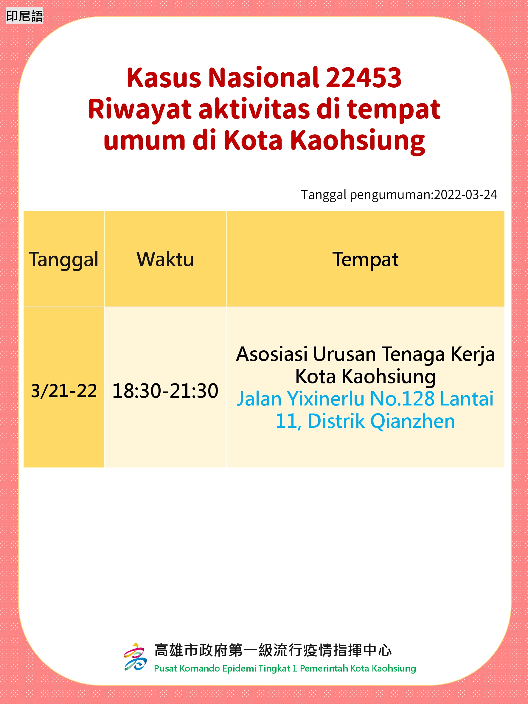 活動訊息:Rekam Jejak Kasus di Tempat Umum Kota Kaohsiung. Tanggal Diumumkan: 24 Maret 2022