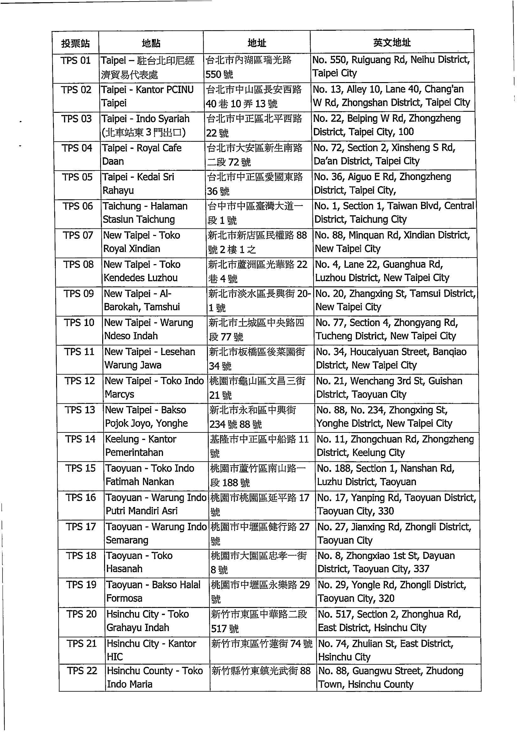 🔔Pemberitahuan Penting🔔Pemilu Indonesia 2024 akan berlangsung pada tanggal 14 Februari 2024. Pekerja Migran Indonesia yang berada di Taiwan dapat memberikan hak suaranya dengan mendatangi Tempat Pemungutan Suara (TPS) yang telah ditentukan.Silakan merujuk ke situs web berikut untuk informasi TPS:https://daftar.pplntaipei2024.org/map