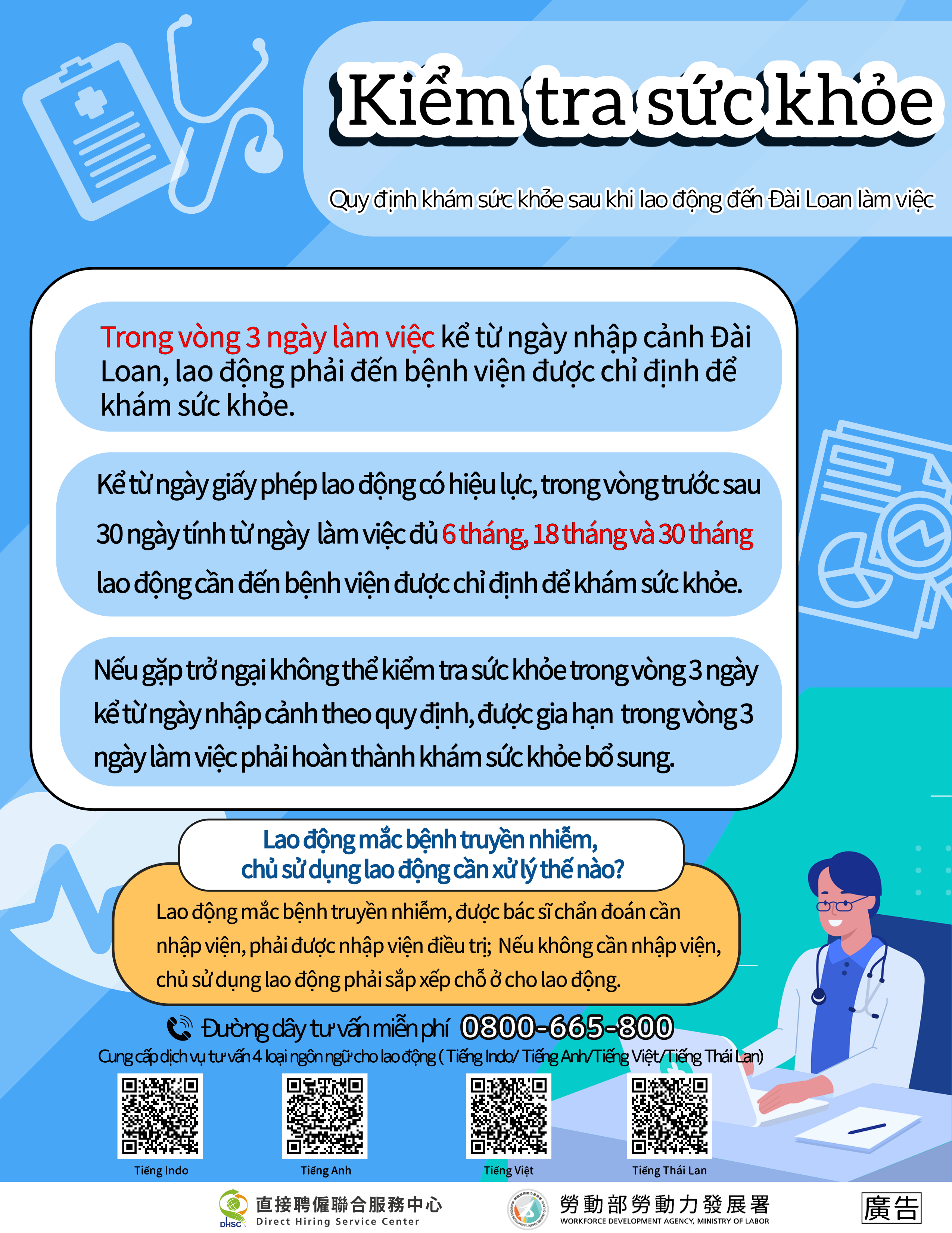 •Trong vòng 3 ngày làm việc kể từ ngày nhập cảnh Đài Loan, lao động phải đến bệnh viện được chỉ định để khám sức khỏe.