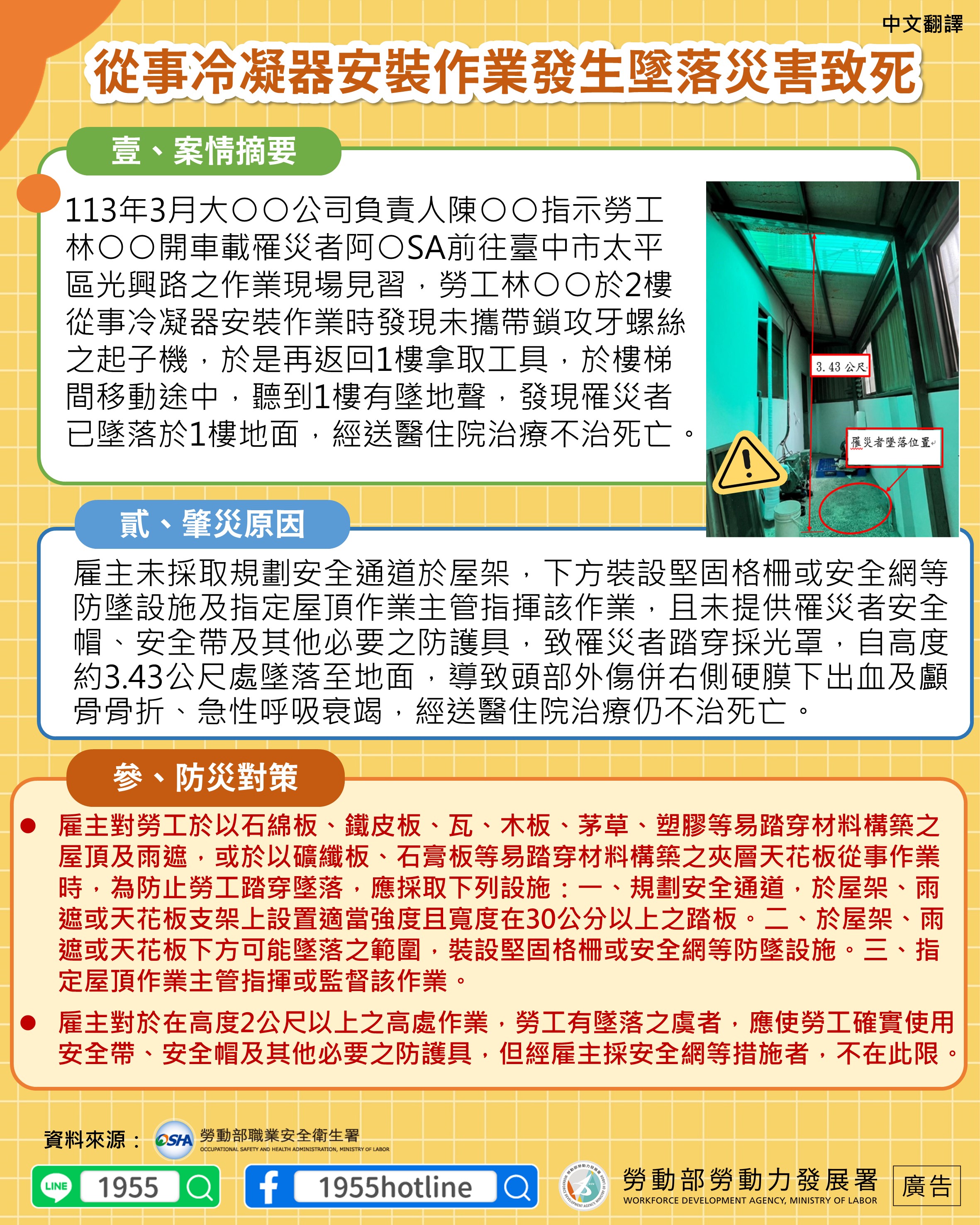 【從事冷凝器安裝作業發生墜落災害致死】職災案例