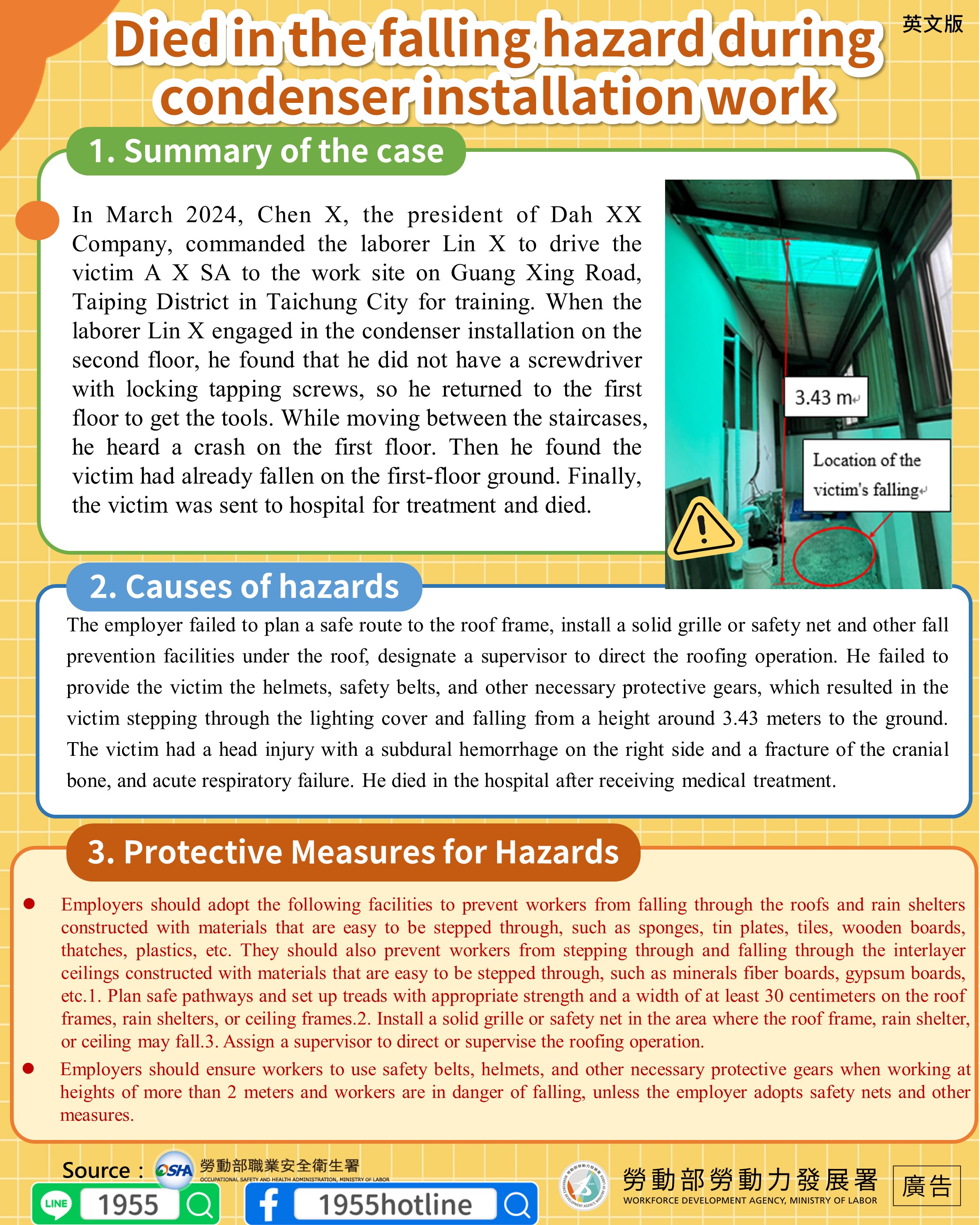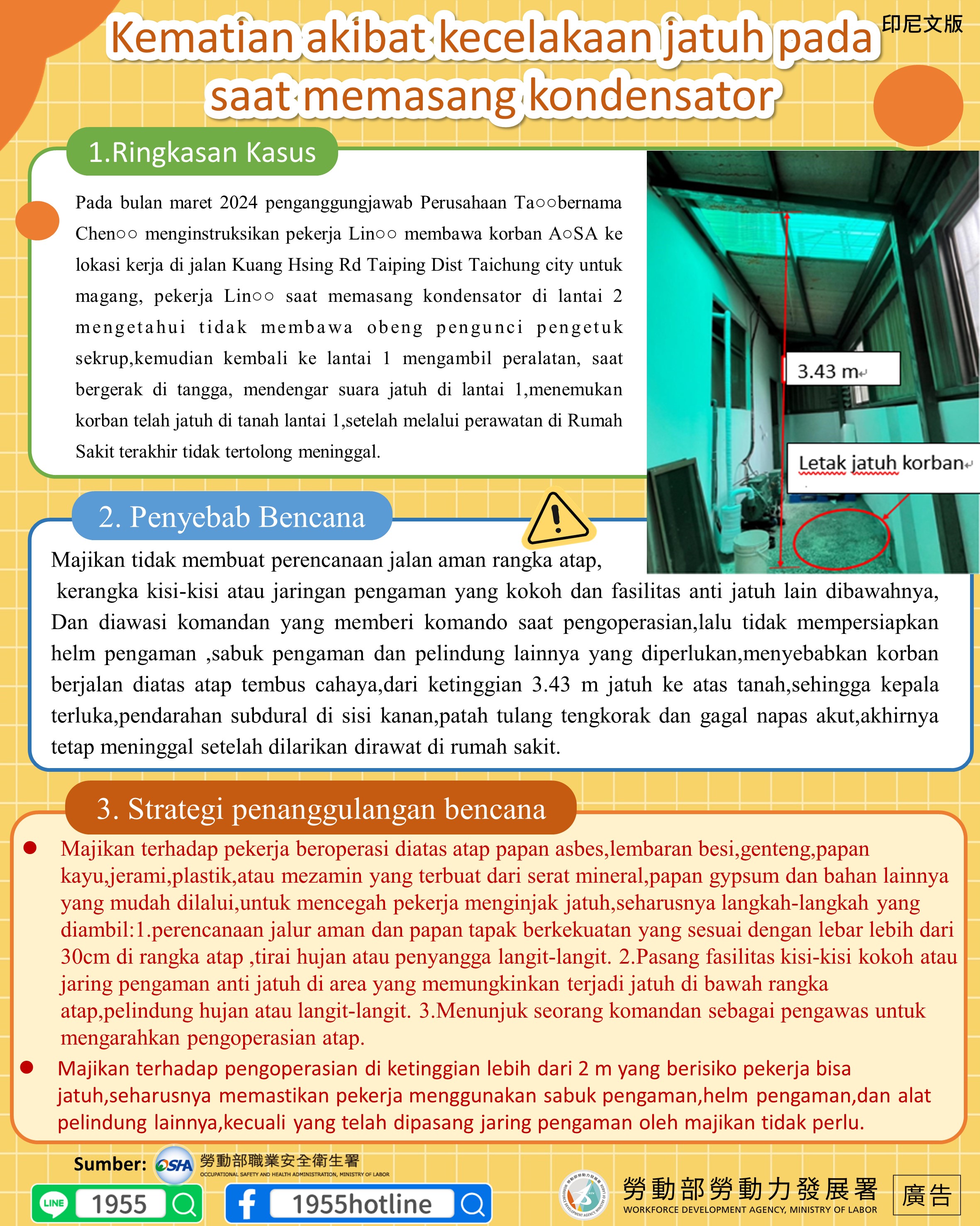 Pada bulan maret 2024 penganggungjawab Perusahaan Ta○○bernama Chen○○ menginstruksikan pekerja Lin○○ membawa korban A○SA ke lokasi kerja di jalan Kuang Hsing Rd Taiping Dist Taichung city untuk magang, pekerja Lin○○ saat memasang kondensator di lantai 2 mengetahui tidak membawa obeng pengunci pengetuk sekrup,kemudian kembali ke lantai 1 mengambil peralatan, saat bergerak di tangga, mendengar suara jatuh di lantai 1,menemukan korban telah jatuh di tanah lantai 1,setelah melalui perawatan di Rumah Sakit terakhir tidak tertolong meninggal.