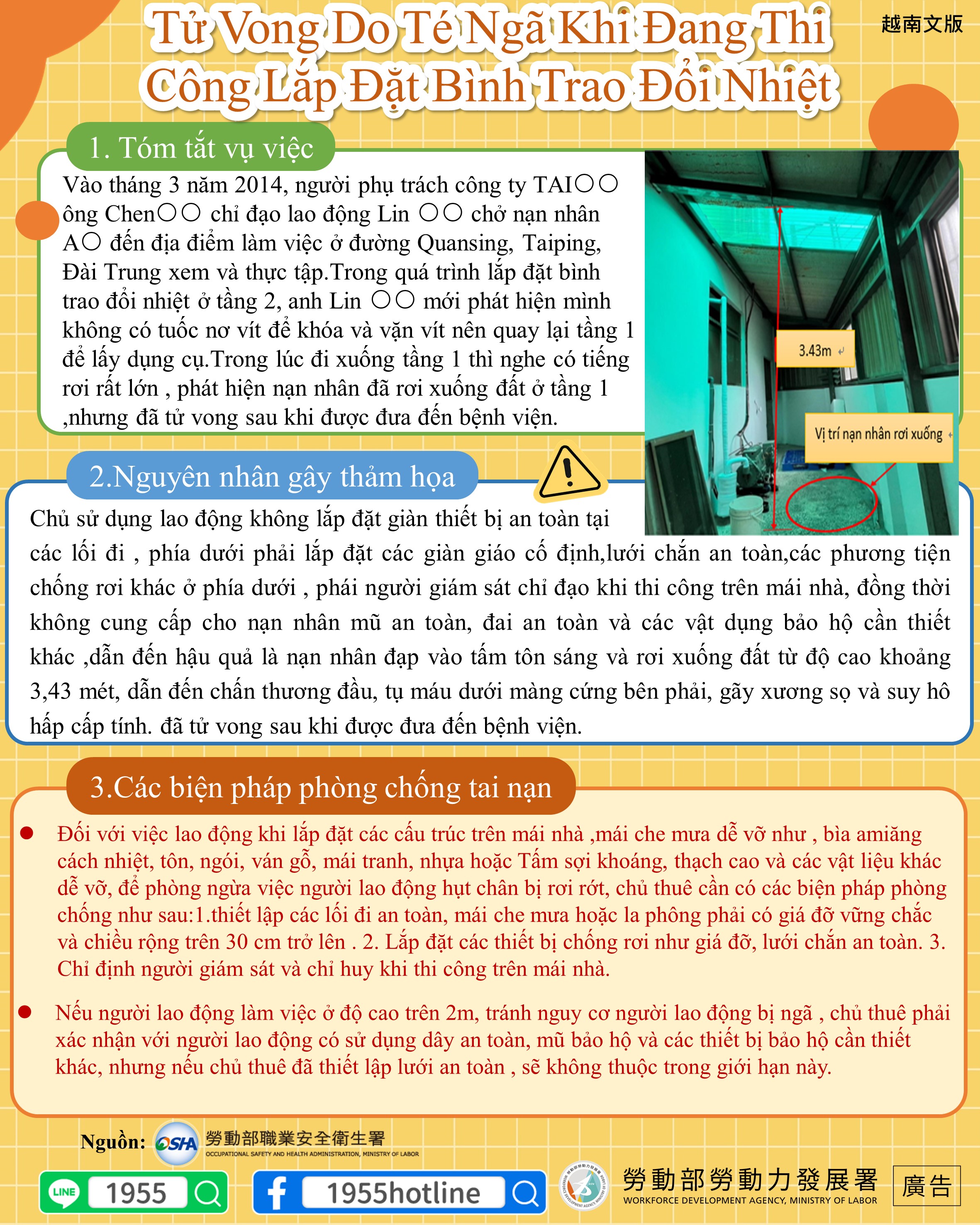 Vào tháng 3 năm 2014, người phụ trách công ty TAI○○ ông Chen○○ chỉ đạo lao động Lin ○○ chở nạn nhân A○ đến địa điểm làm việc ở đường Quansing, Taiping,Đài Trung xem và thực tập.Trong quá trình lắp đặt bình trao đổi nhiệt ở tầng 2, anh Lin ○○ mới phát hiện mình không có tuốc nơ vít để khóa và vặn vít nên quay lại tầng 1 để lấy dụng cụ.Trong lúc đi xuống tầng 1 thì nghe có tiếng rơi rất lớn , phát hiện nạn nhân đã rơi xuống đất ở tầng 1 ,nhưng đã tử vong sau khi được đưa đến bệnh viện.