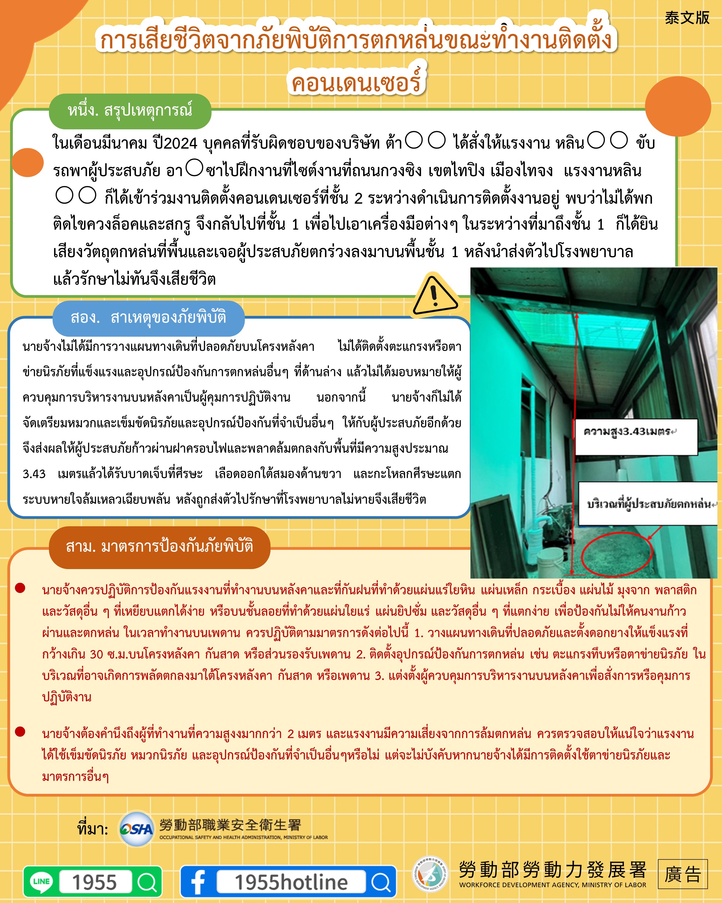 นายจ้างไม่ได้มีการวางแผนทางเดินที่ปลอดภัยบนโครงหลังคา ไม่ได้ติดตั้งตะแกรงหรือตาข่ายนิรภัยที่แข็งแรงและอุปกรณ์ป้องกันการตกหล่นอื่นๆ ที่ด้านล่าง แล้วไม่ได้มอบหมายให้ผู้ควบคุมการบริหารงานบนหลังคาเป็นผู้คุมการปฏิบัติงาน นอกจากนี้ นายจ้างก็ไม่ได้จัดเตรียมหมวกและเข็มขัดนิรภัยและอุปกรณ์ป้องกันที่จำเป็นอื่นๆ ให้กับผู้ประสบภัยอีกด้วย จึงส่งผลให้ผู้ประสบภัยก้าวผ่านฝาครอบไฟและพลาดล้มตกลงกับพื้นที่มีความสูงประมาณ 3.43 เมตรแล้วได้รับบาดเจ็บที่ศีรษะ เลือดออกใต้สมองด้านขวา และกะโหลกศีรษะแตก ระบบหายใจล้มเหลวเฉียบพลัน หลังถูกส่งตัวไปรักษาที่โรงพยาบาลไม่หายจึงเสียชีวิต