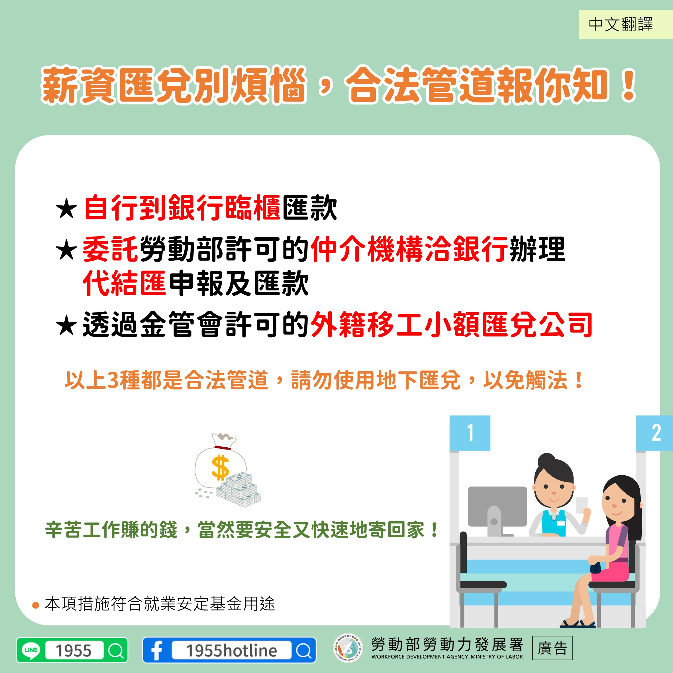 •Commission a labor brokerage licensed by the Ministry of Labor to make arrangements with the bank to remit payments on your behalf