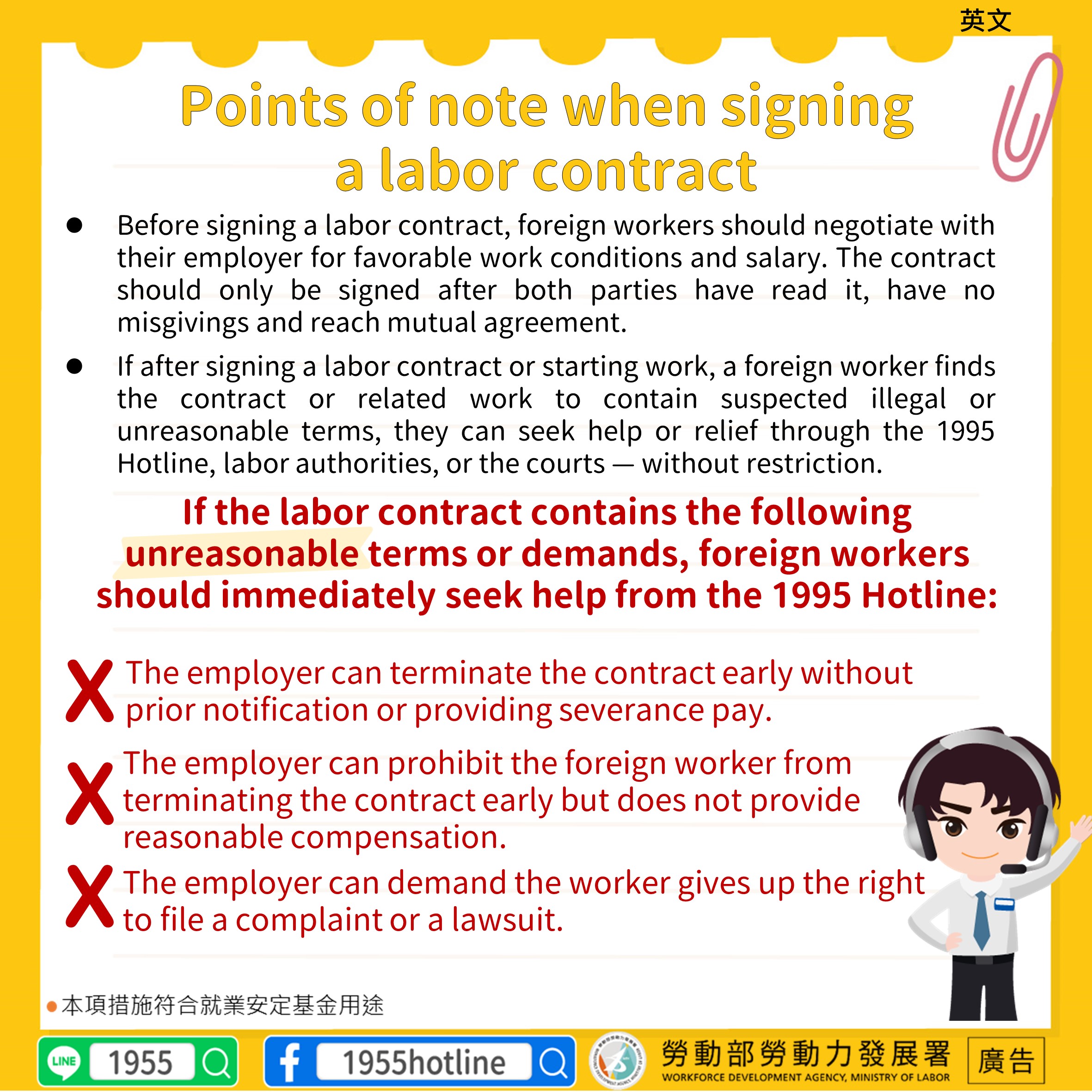 If the labor contract contains the following unreasonable terms or demands, foreign workers should immediately seek help from the 1995 Hotline: