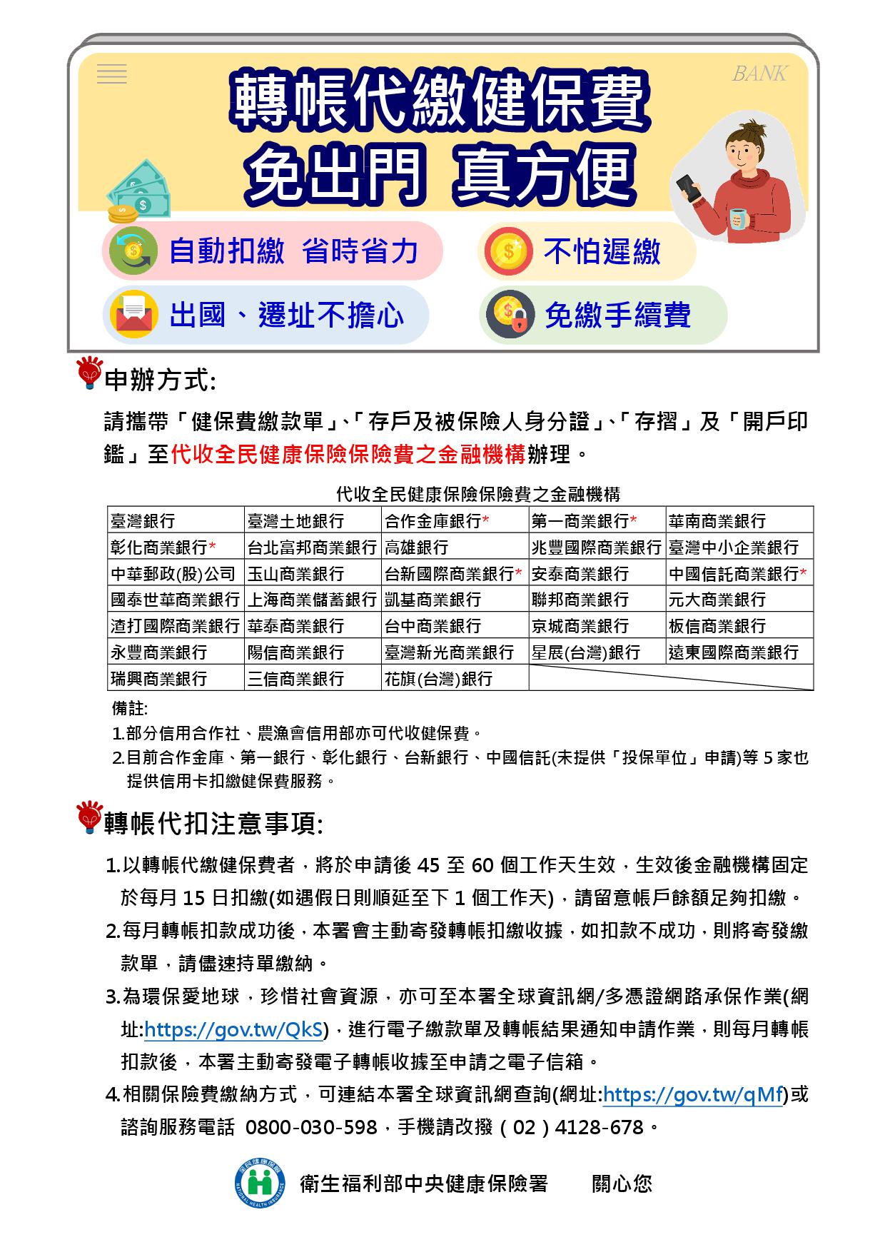 •[另開新視窗]雇主申報外籍移工投(退)保健保Q&A •[另開新視窗]轉帳代繳健保費 免出門 真方便