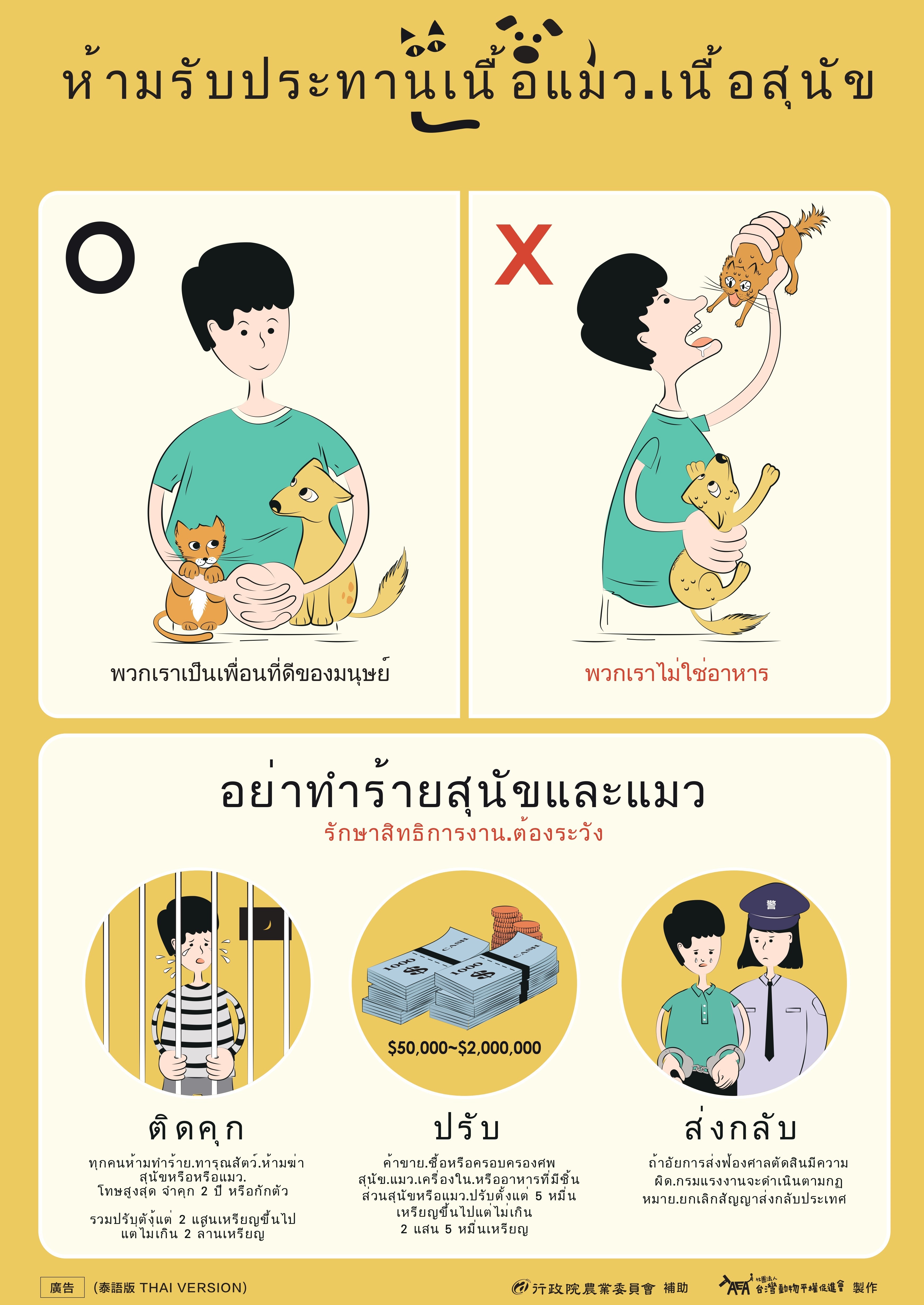 活動訊息:(農業部)避免移工違反我國禁止宰殺及食用犬貓宣導海報-多國語言版