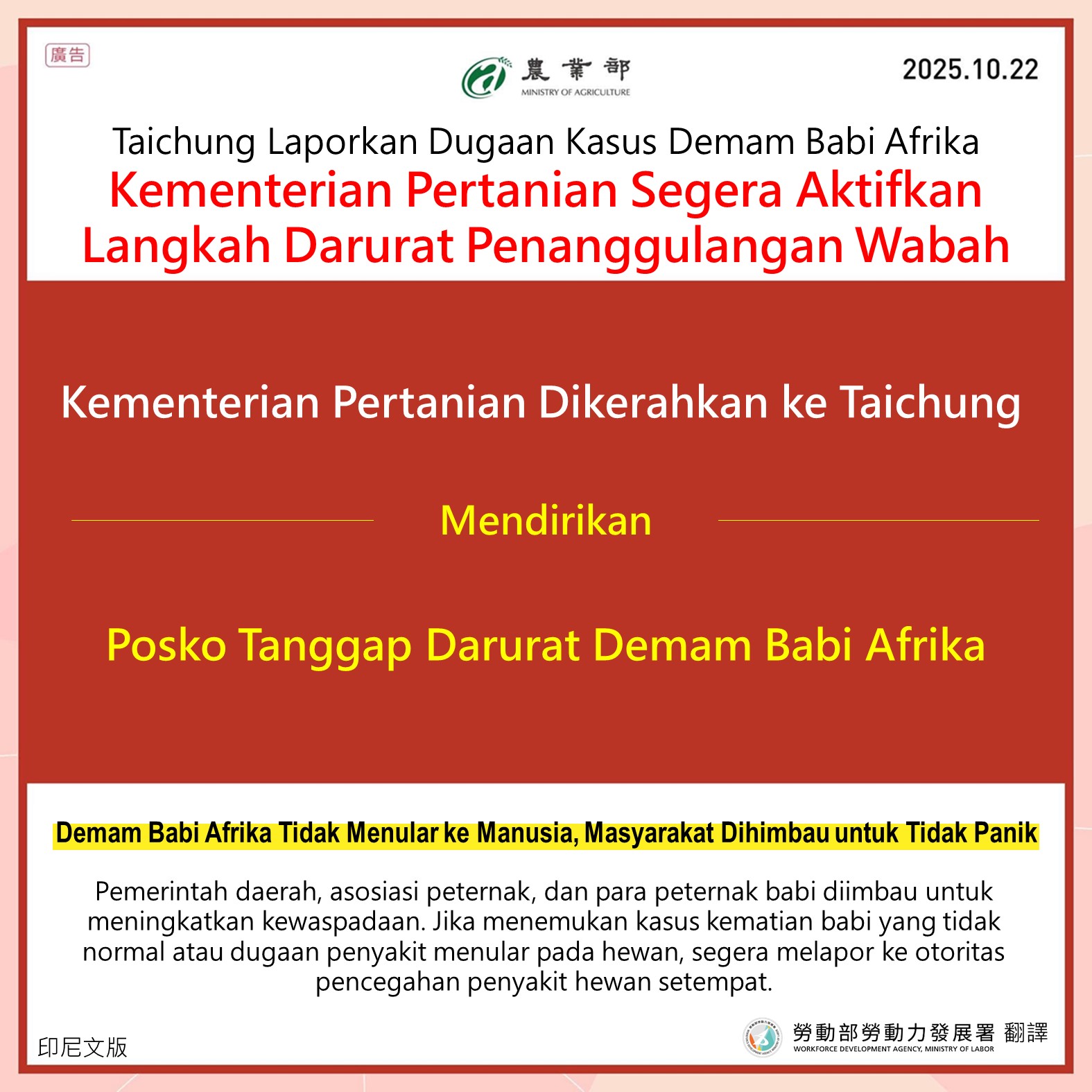 活動訊息:Kementerian Pertanian Dikerahkan ke Taichung Mendirikan Posko Tanggap Darurat Demam Babi Afrika