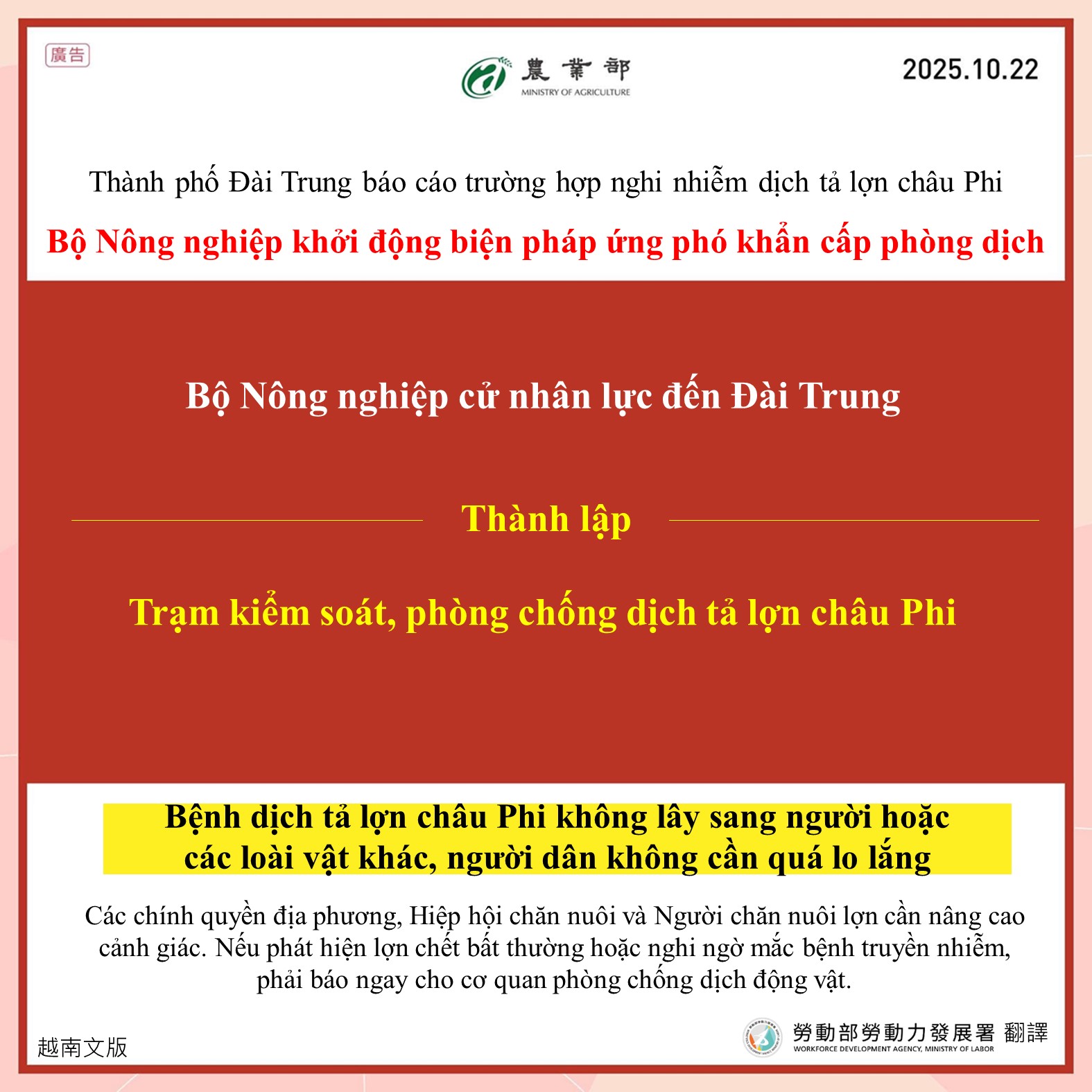 活動訊息:Bộ Nông nghiệp cử nhân lực đến Đài Trung Thành lập Trạm kiểm soát, phòng chống dịch tả lợn châu Phi