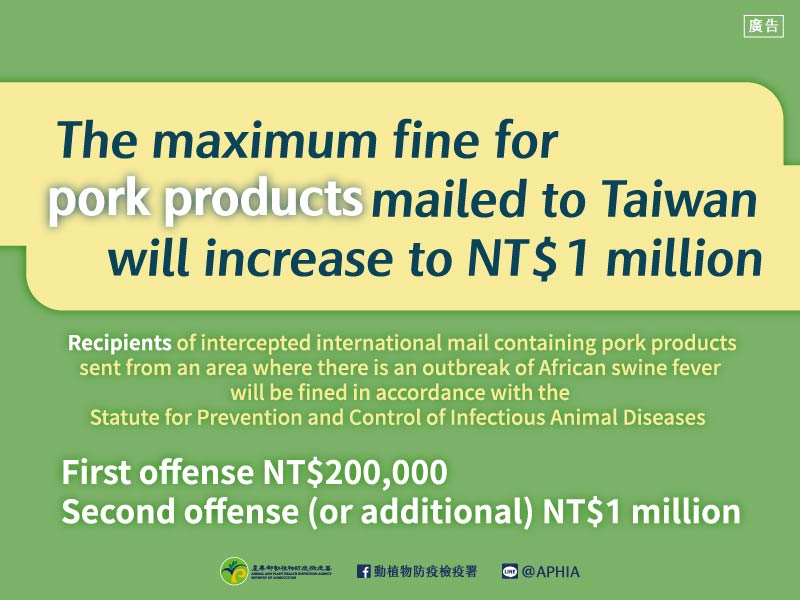 活動訊息:The maximum fine for pork products mailed to Taiwan will increase to NT$1 million