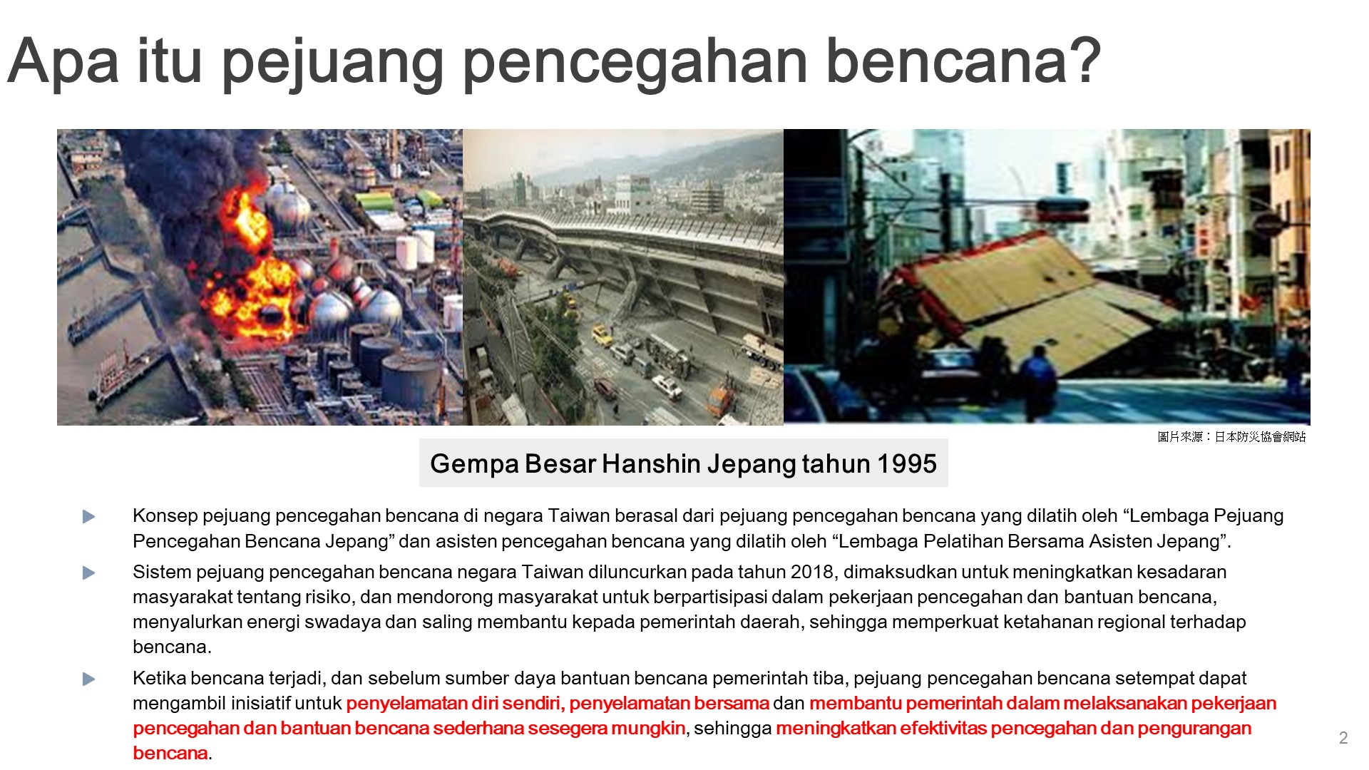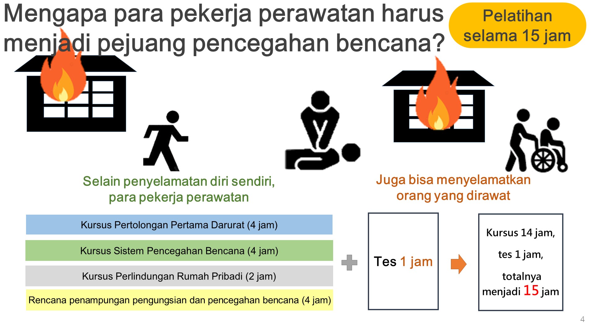 內政部為鼓勵外籍家庭看護移工加入防災士行列,讓外籍家庭看護工於實際生活中具備防災應變能力,特辦理「外籍看護移工防災士培訓」課程訓練活動,培育其自助、助人能力,相關資訊摘陳如下: