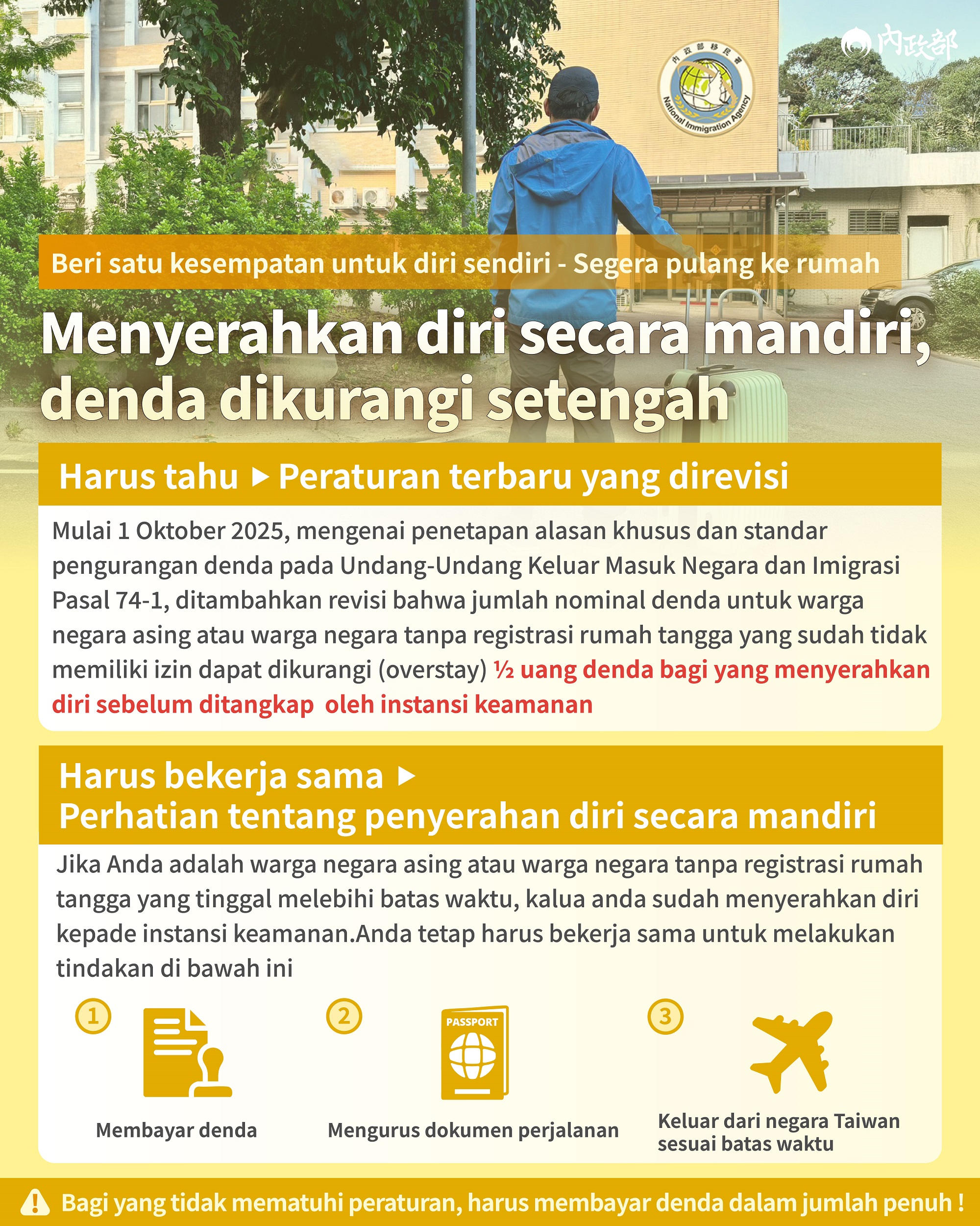 活動訊息:Direktorat Jenderal Imigrasi (NIA) : Beri satu kesempatan untuk diri sendiri - Segera pulang ke rumah Menyerahkan diri secara mandiri, denda dikurangi setengah