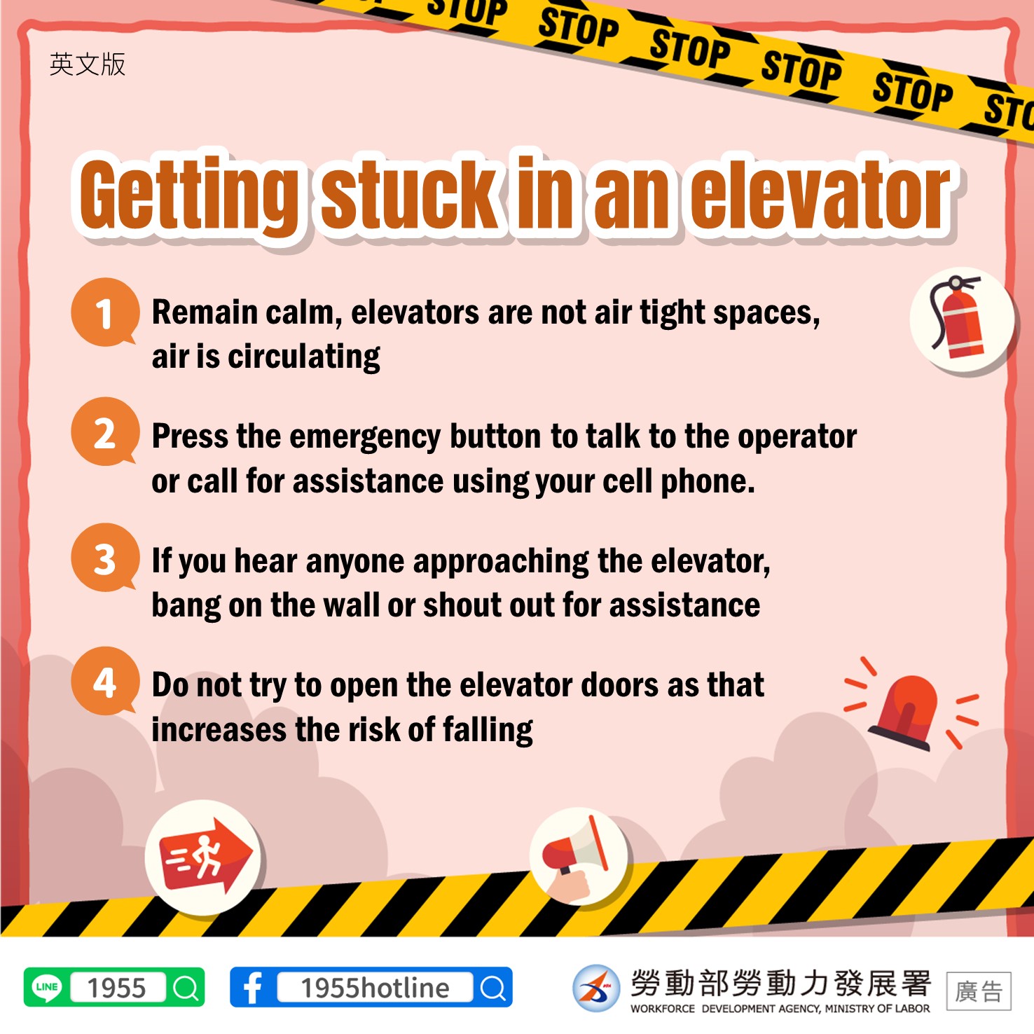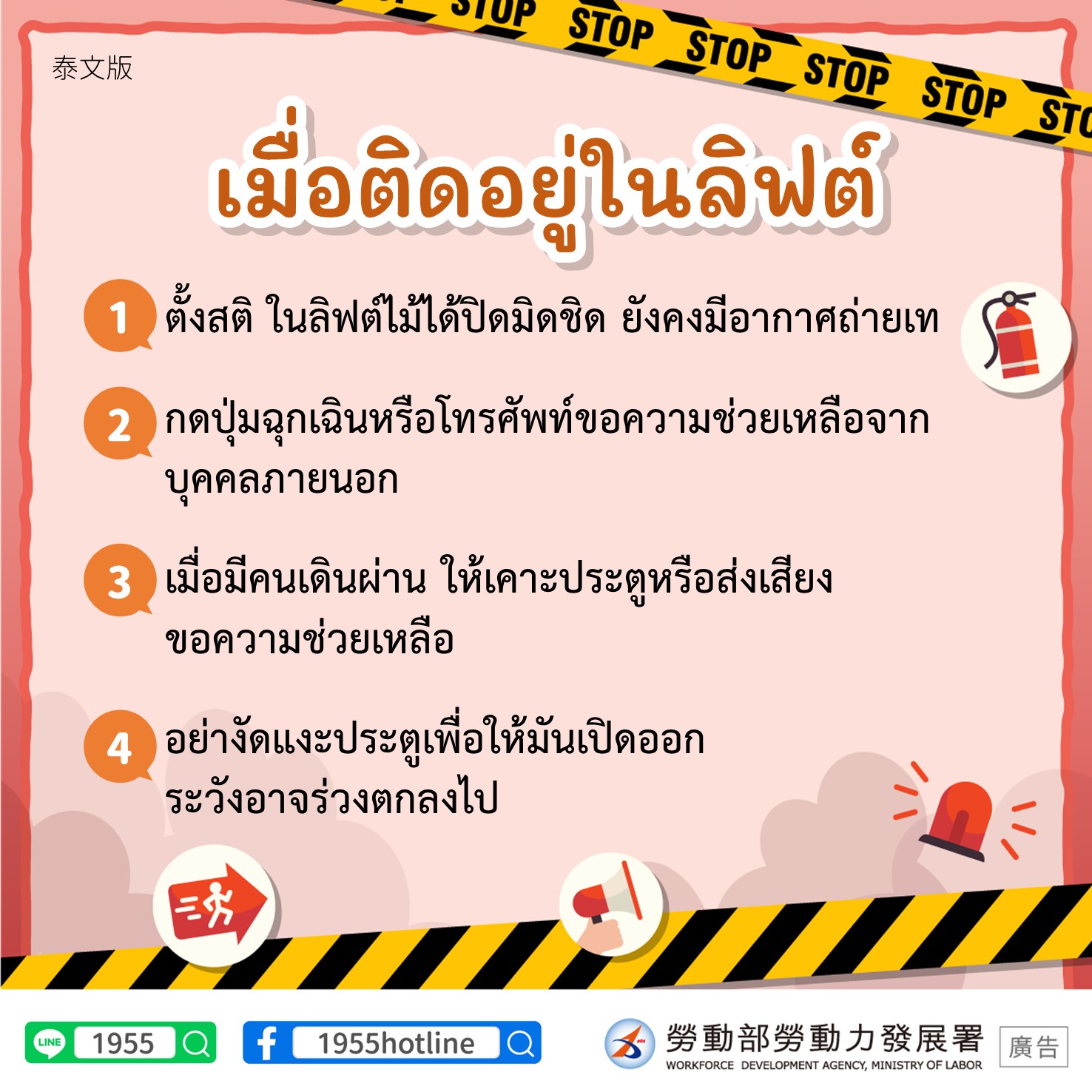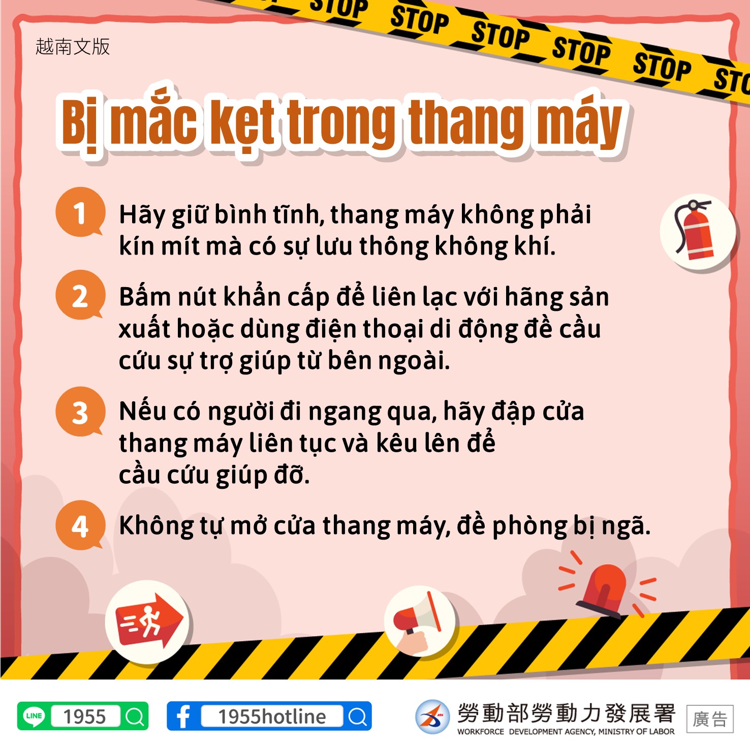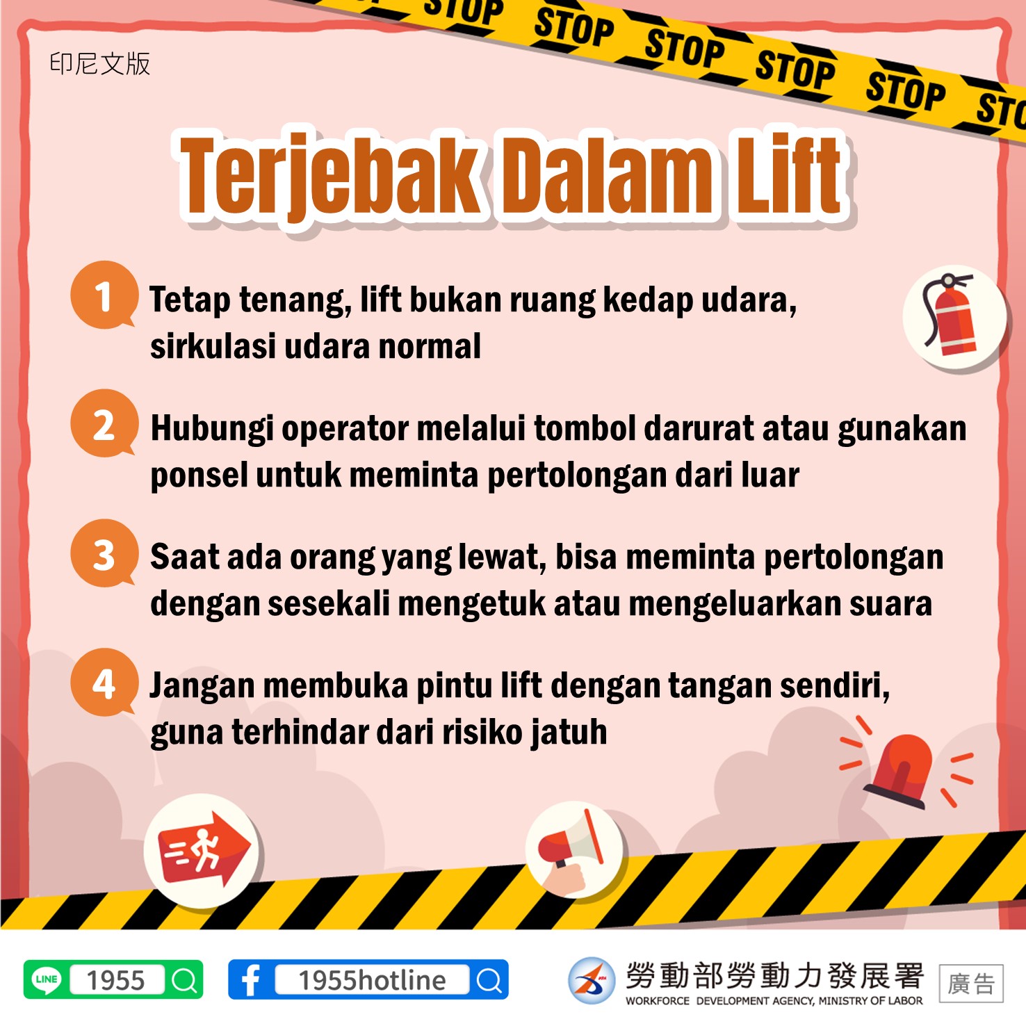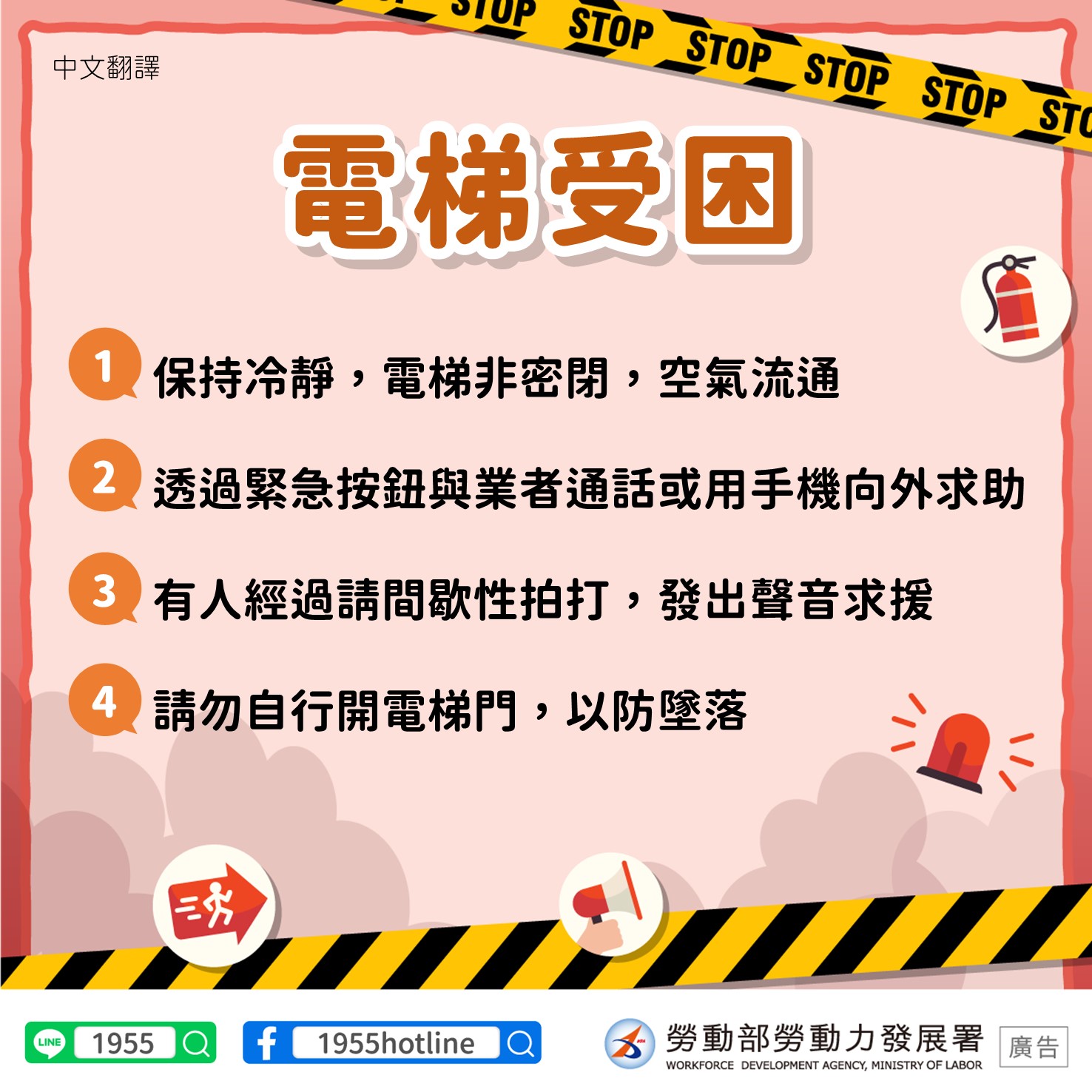 電梯受困1.保持冷靜,電梯非密閉,空氣流通2.透過緊急按鈕與業者通話或用手機向外求助3.有人經過請間歇性拍打,發出聲音求援4.請勿自行開電梯門,以防墜落英文版Getting stuck in an elevator1. Remain calm, elevators are not air tight spaces, air is circulating2. Press the emergency button to talk to the operator or call for assistance using your cell phone.3. If you hear anyone approaching the elevator, intermittently bang on the wall or shout out for assistance4. Do not try to open the elevator doors as that increases the risk of falling印尼文版Terjebak Dalam Lift1. Tetap tenang, lift bukan ruang kedap udara, sirkulasi udara normal2. Hubungi operator melalui tombol darurat atau gunakan ponsel untuk meminta pertolongan dari luar3. Saat ada orang yang lewat, bisa meminta pertolongan dengan sesekali mengetuk atau mengeluarkan suara4. Jangan membuka pintu lift dengan tangan sendiri, guna terhindar dari risiko jatuh越南文版Bị mắc kẹt trong thang máy1. Hãy giữ bình tĩnh, thang máy không phải kín mít mà có sự lưu thông không khí. 2. Bấm nút khẩn cấp để liên lạc với hãng sản xuất hoặc dùng điện thoại di động đề cầu cứu sự trợ giúp từ bên ngoài. 3. Nếu có người đi ngang qua, hãy đập cửa thang máy liên tục và kêu lên để cầu cứu giúp đỡ. 4. Không tự mở cửa thang máy, đề phòng bị ngã.泰文版เมื่อติดอยู่ในลิฟต์1. ตั้งสติ ในลิฟต์ไม้ได้ปิดมิดชิด ยังคงมีอากาศถ่ายเท2. กดปุ่มฉุกเฉินหรือโทรศัพท์ขอความช่วยเหลือจากบุคคลภายนอก3. เมื่อมีคนเดินผ่าน ให้เคาะประตูหรือส่งเสียงขอความช่วยเหลือ4. อย่างัดแงะประตูเพื่อให้มันเปิดออก ระวังอาจร่วงตกลงไป