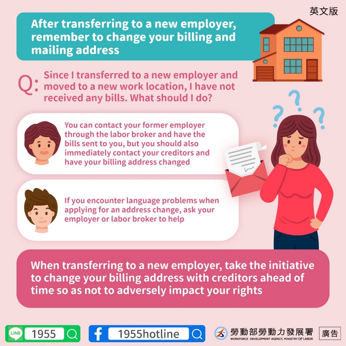 Q: Since I transferred to a new employer and moved to a new work location, I have not received any bills. What should I do?A1: You can contact your former employer through the labor broker and have the bills sent to you, but you should also immediately contact your creditors and have your billing address changedA2: If you encounter language problems when applying for an address change, ask your employer or labor broker to helpWhen transferring to a new employer, take the initiative to change your billing address with creditors ahead of time so as not to adversely impact your rights