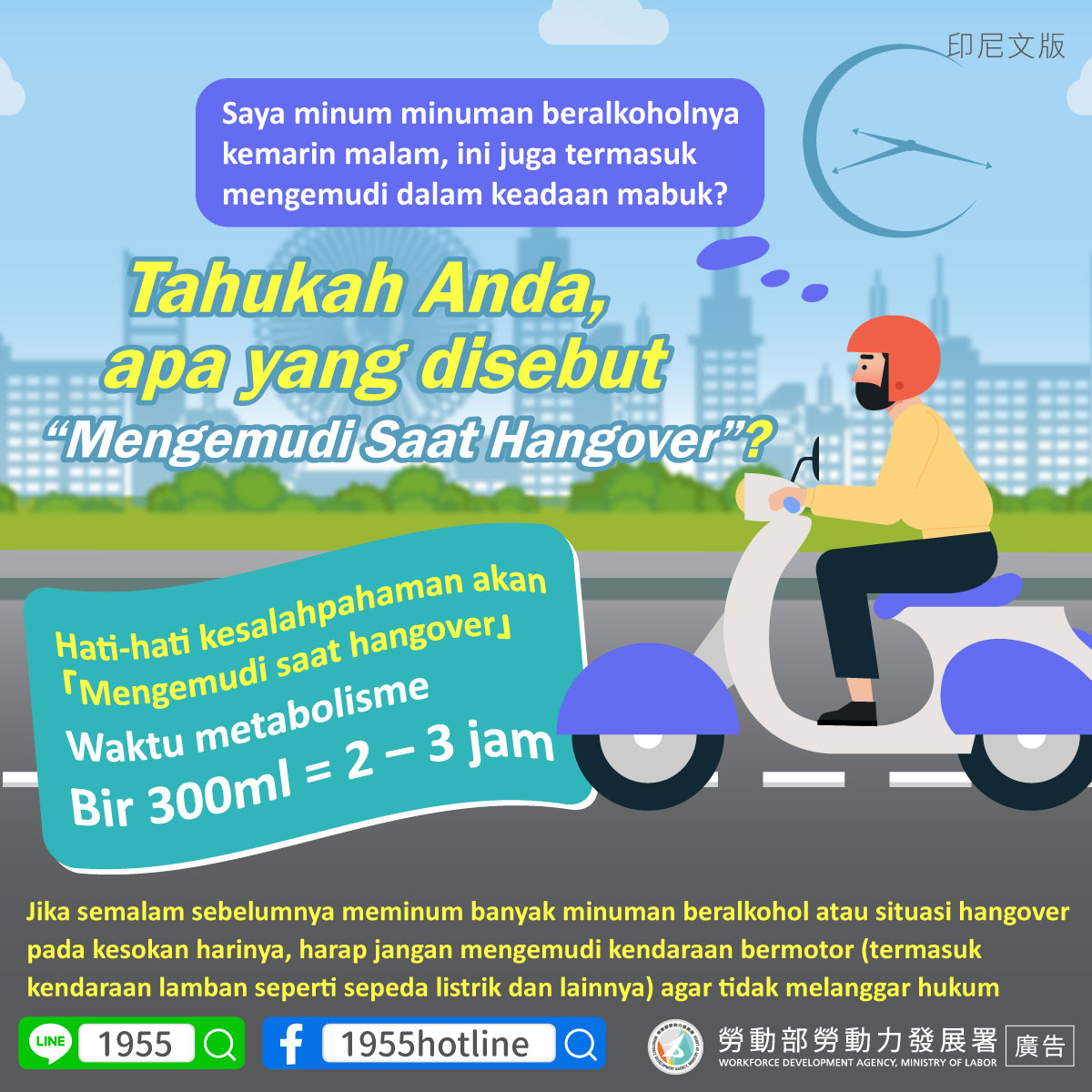 ▍Tahukah Anda, apa yang disebut “Mengemudi Saat Hangover”?「Saya minum minuman beralkoholnya kemarin malam, ini juga termasuk mengemudi dalam keadaan mabuk? 」Hati-hati kesalahpahaman akan「Mengemudi saat hangover」Waktu metabolismeBir 300ml = 2 – 3 jamJika semalam sebelumnya meminum banyak minuman beralkohol atau situasi hangover pada kesokan harinya, harap jangan mengemudi kendaraan bermotor (termasuk kendaraan lamban seperti sepeda listrik dan lainnya) agar tidak melanggar hokum