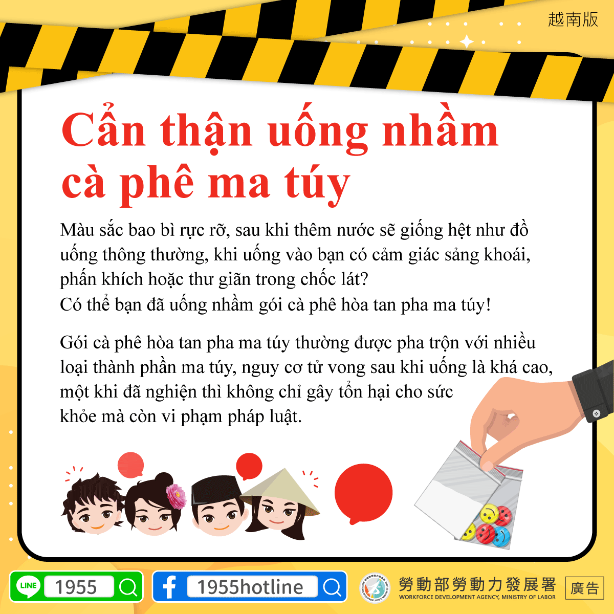 ▍Cẩn thận uống nhầm cà phê ma túyMàu sắc bao bì rực rỡ, sau khi thêm nước sẽ giống hệt như đồ uống thông thường, khi uống vào bạn có cảm giác sảng khoái, phấn khích hoặc thư giãn trong chốc lát?Có thể bạn đã uống nhầm gói cà phê hòa tan pha ma túy!Gói cà phê hòa tan pha ma túy thường được pha trộn với nhiều loại thành phần ma túy, nguy cơ tử vong sau khi uống là khá cao, một khi đã nghiện thì không chỉ gây tổn hại cho sức khỏe mà còn vi phạm pháp luật.