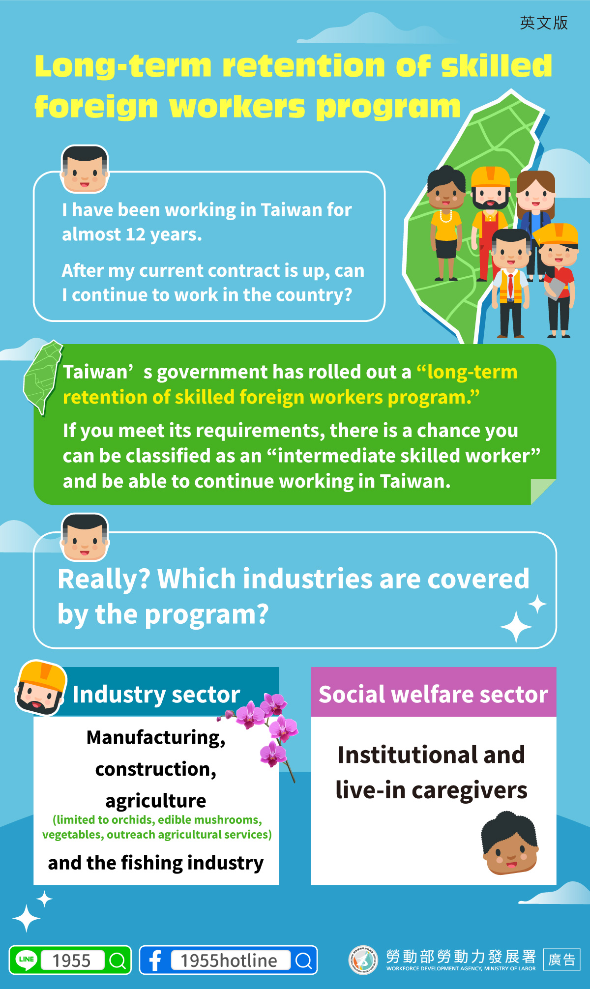 ▍Long-term retention of skilled foreign workers programA. I have been working in Taiwan for almost 12 years. After my current contract is up, can I continue to work in the country?B. Taiwan’s government has rolled out a “long-term retention of skilled foreign workers program.” If you meet its requirements, there is a chance you can be classified as an “intermediate skilled worker” and be able to continue working in Taiwan.A: Really? Which industries are covered by the program?Industry sector:Manufacturing, construction,agriculture (limited to orchids, edible mushrooms, vegetables, outreach agricultural services) and the fishing industrySocial welfare sector:Institutional and live-in caregivers
