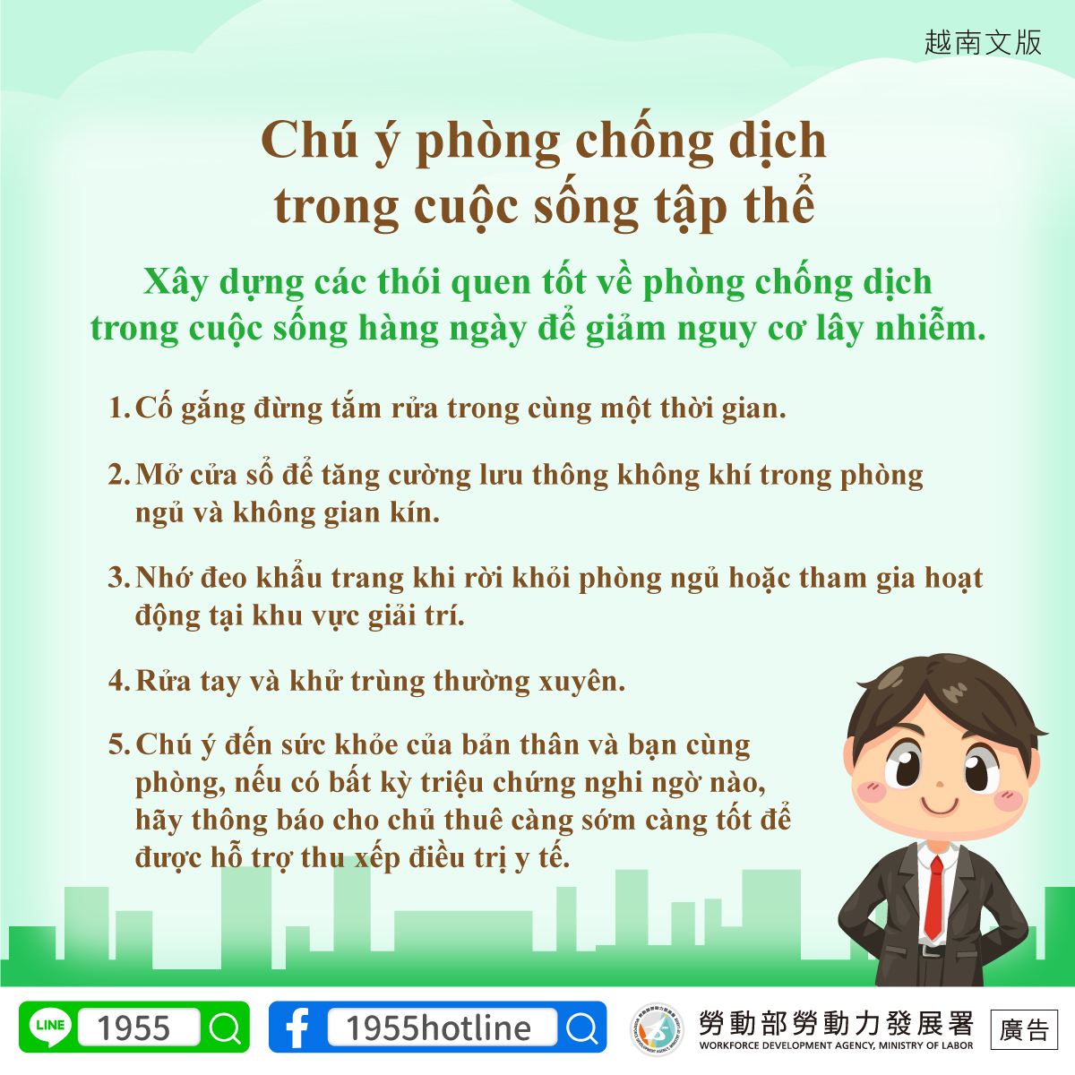 ▍Chú ý phòng chống dịch trong cuộc sống tập thểXây dựng các thói quen tốt về phòng chống dịch trong cuộc sống hàng ngày để giảm nguy cơ lây nhiễm.1. Cố gắng đừng tắm rửa trong cùng một thời gian.2. Mở cửa sổ để tăng cường lưu thông không khí trong phòng ngủ và không gian kín. 3. Nhớ đeo khẩu trang khi rời khỏi phòng ngủ hoặc tham gia hoạt động tại khu vực giải trí.4. Rửa tay và khử trùng thường xuyên.5. Chú ý đến sức khỏe của bản thân và bạn cùng phòng, nếu có bất kỳ triệu chứng nghi ngờ nào, hãy thông báo cho chủ thuê càng sớm càng tốt để được hỗ trợ thu xếp điều trị y tế.
