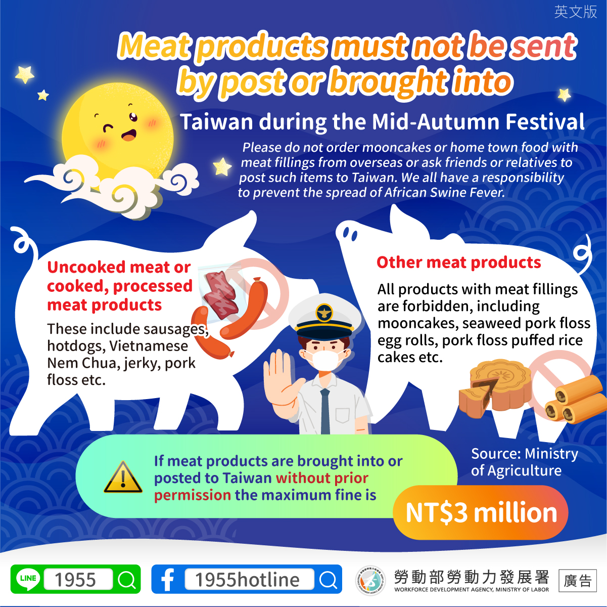Please do not order mooncakes or home town food with meat fillings from overseas or ask friends or relatives to post such items to Taiwan. We all have a responsibility to prevent the spread of African Swine Fever.