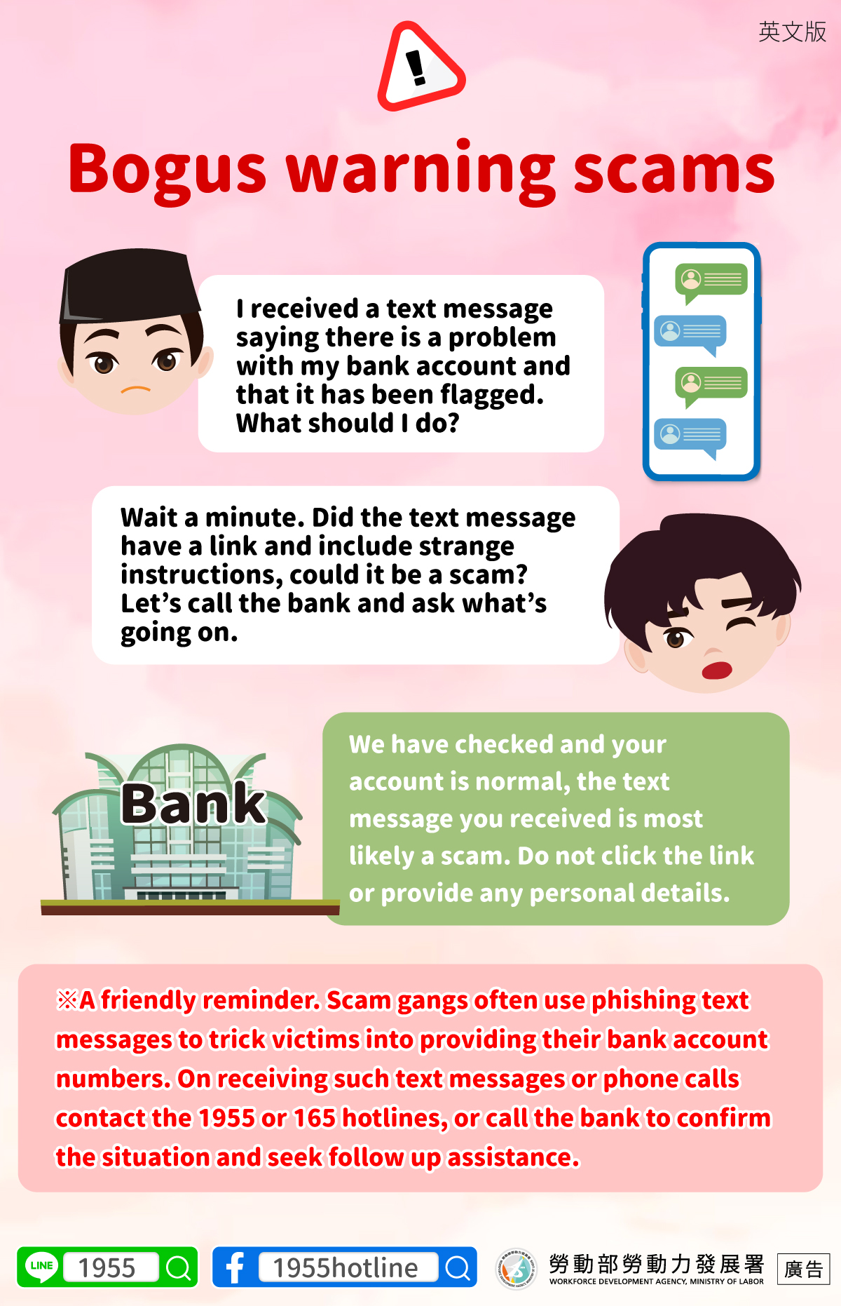 ※A friendly reminder. Scam gangs often use phishing text messages to trick victims into providing their bank account numbers. On receiving such text messages or phone calls contact the 1955 or 165 hotlines, or call the bank to confirm the situation and seek follow up assistance.