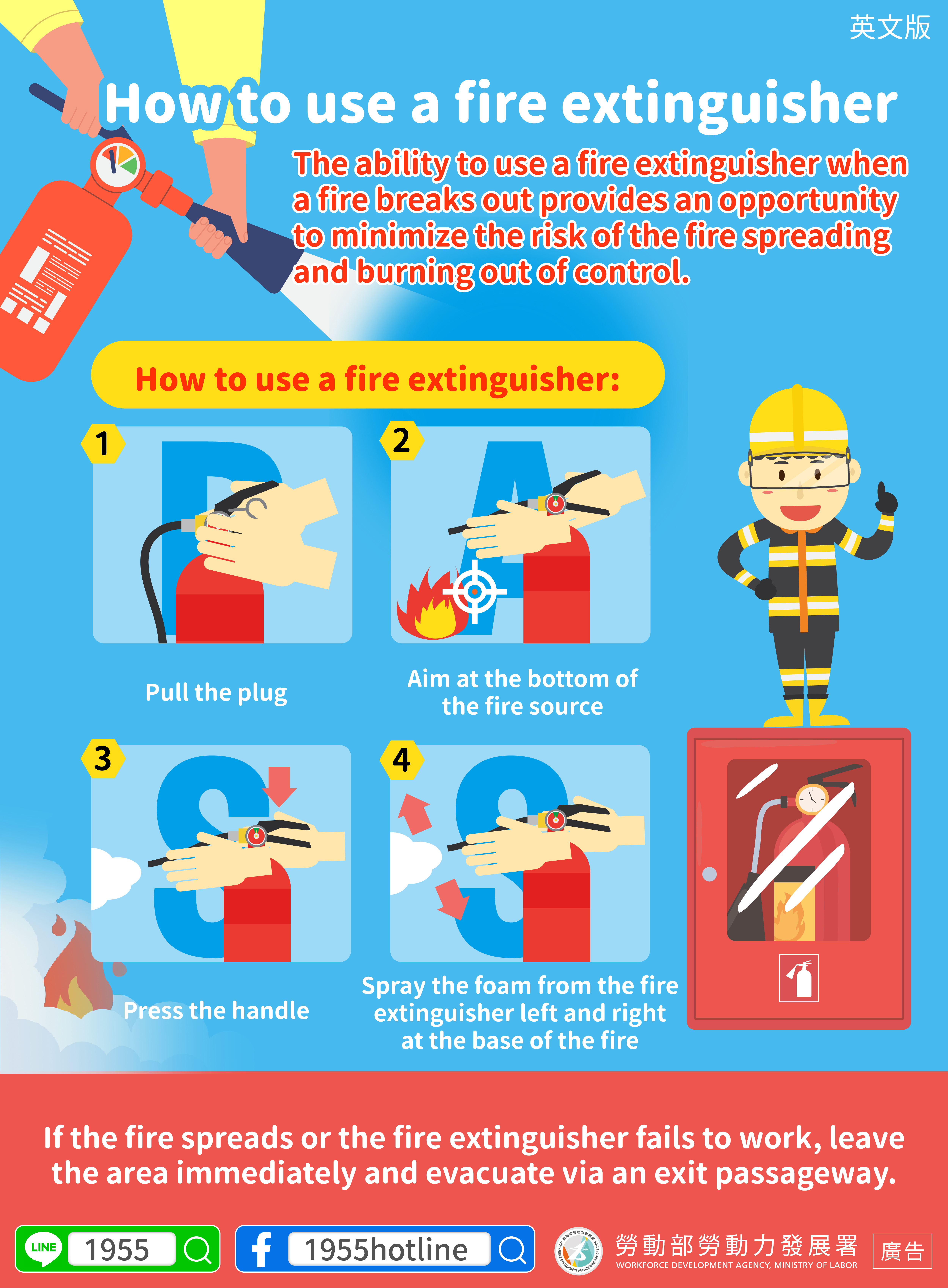 If the fire spreads or the fire extinguisher fails to work, leave the area immediately and evacuate via an exit passageway.