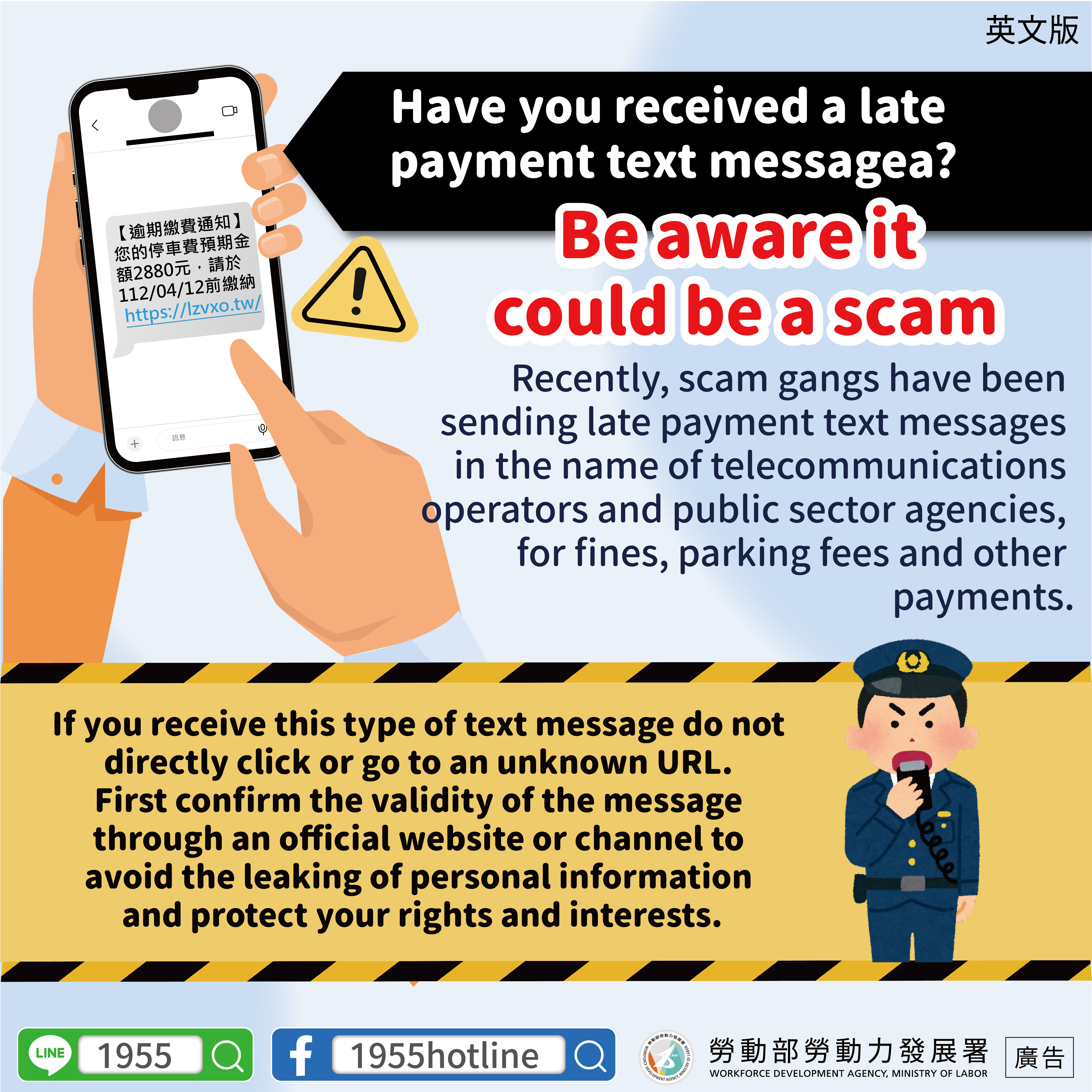 Recently, scam gangs have been sending late payment text messages in the name of telecommunications operators and public sector agencies, for fines, parking fees and other payments.
