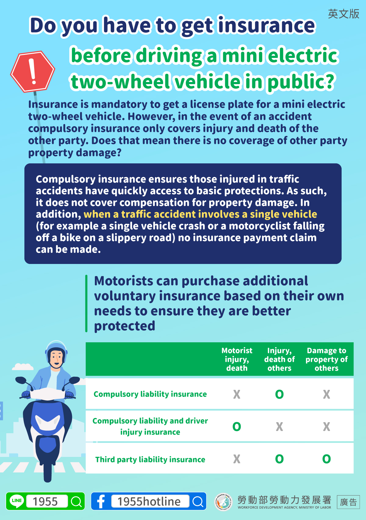 Insurance is mandatory to get a license plate for a mini electric two-wheel vehicle. However, in the event of an accident compulsory insurance only covers injury and death of the other party. Does that mean there is no coverage of other party property damage?