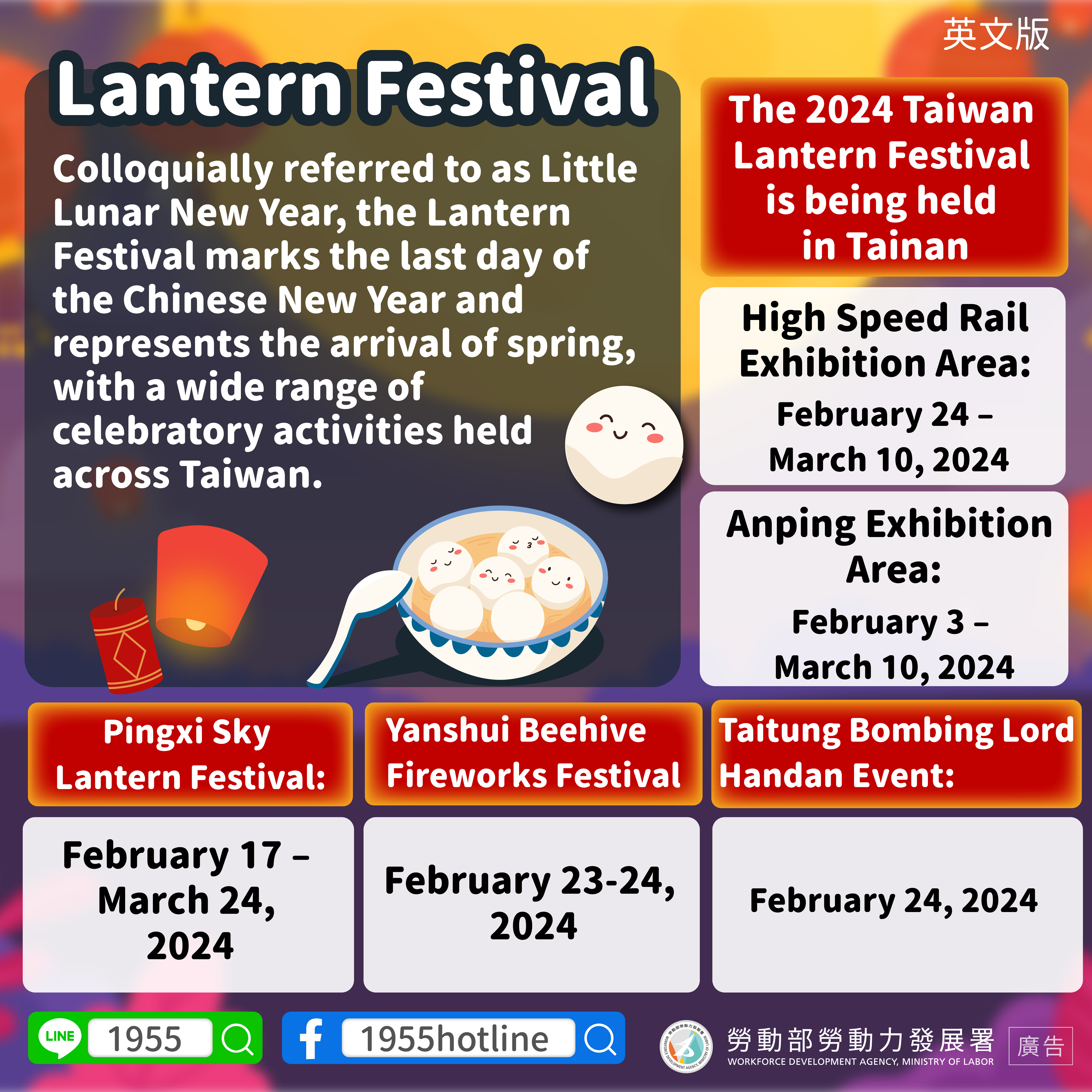 Colloquially referred to as Little Lunar New Year, the Lantern Festival marks the last day of the Chinese New Year and represents the arrival of spring, with a wide range of celebratory activities held across Taiwan.