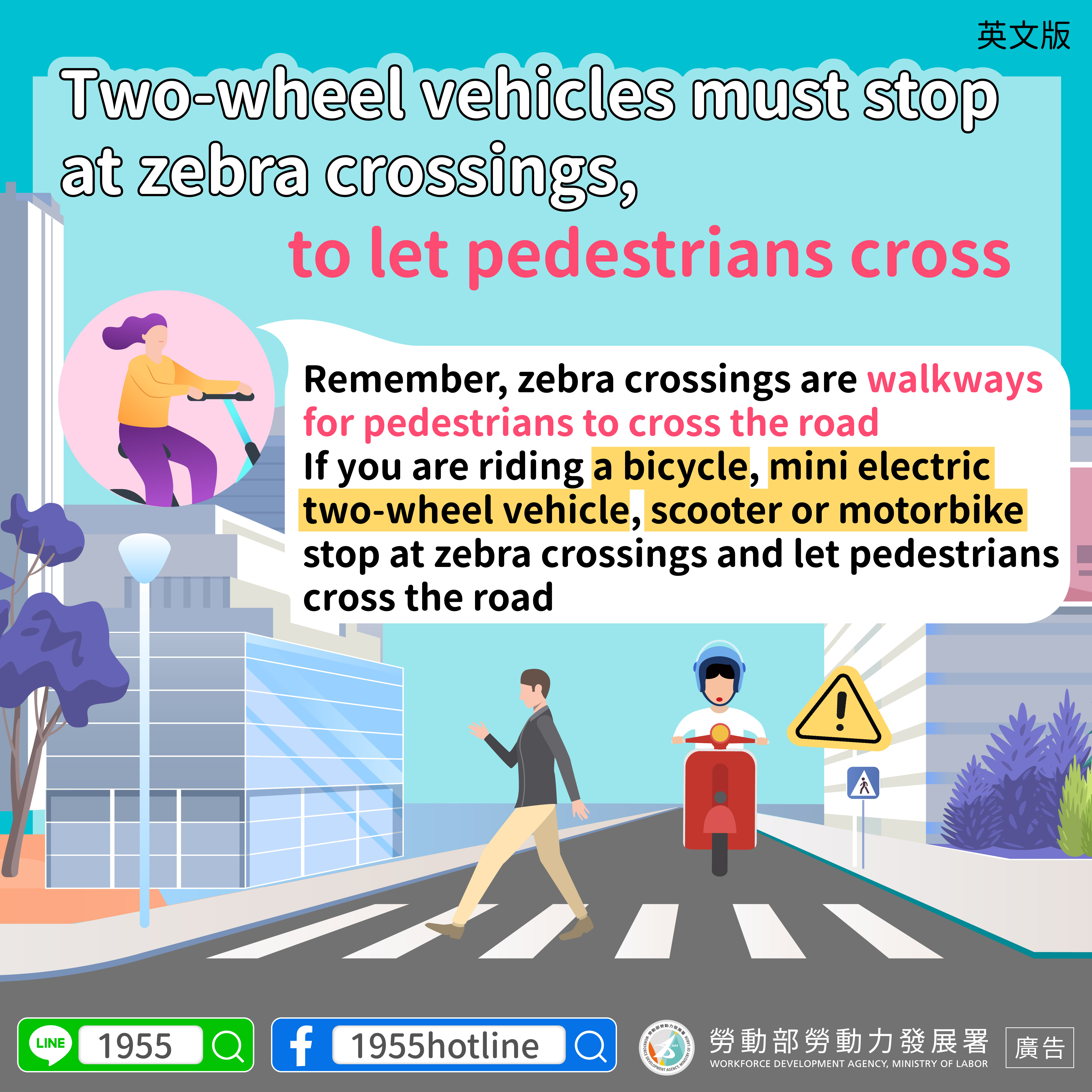 ▍Two-wheel vehicles must stop at zebra crossings,to let pedestrians cross