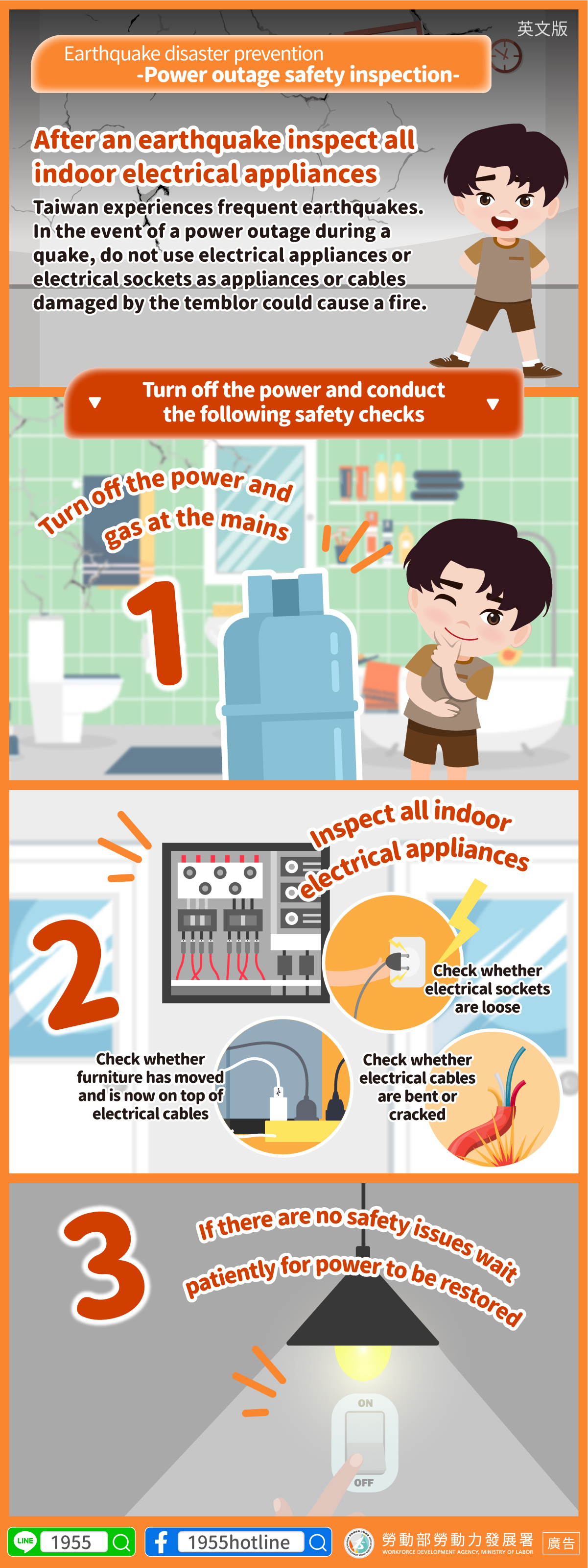 Taiwan experiences frequent earthquakes. In the event of a power outage during a quake, do not use electrical appliances or electrical sockets as appliances or cables damaged by the temblor could cause a fire.