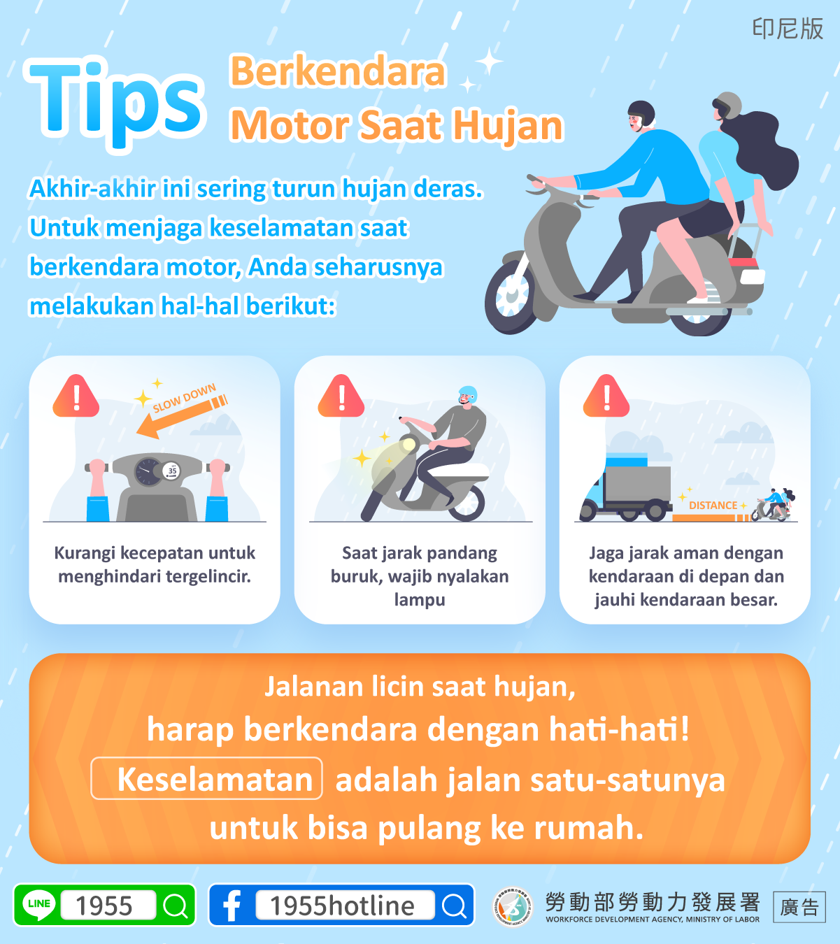 Akhir-akhir ini sering turun hujan deras. Untuk menjaga keselamatan saat berkendara motor, Anda seharusnya melakukan hal-hal berikut: