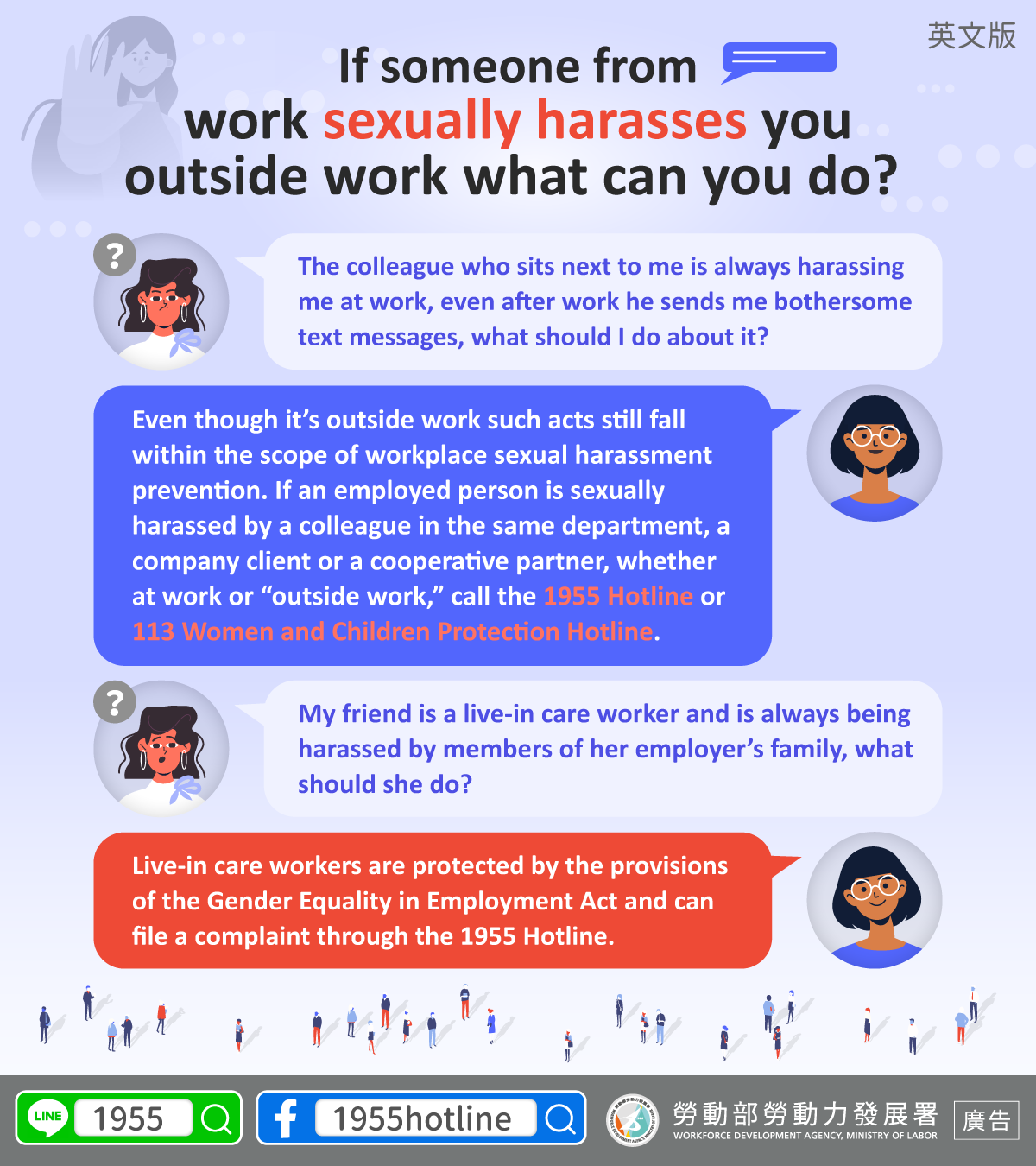 B:Even though it’s outside work such acts still fall within the scope of workplace sexual harassment prevention. If an employed person is sexually harassed by a colleague in the same department, a company client or a cooperative partner, whether at work or “outside work,” call the 1955 Hotline or 113 Women and Children Protection Hotline.