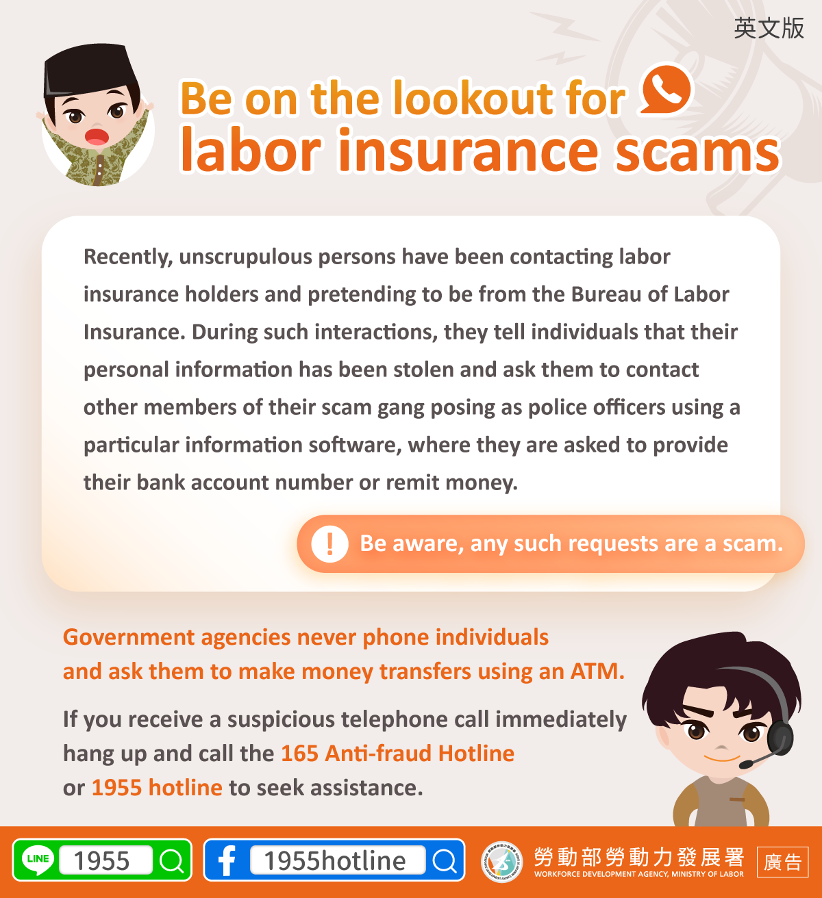 Recently, unscrupulous persons have been contacting labor insurance holders and pretending to be from the Bureau of Labor Insurance. During such interactions, they tell individuals that their personal information has been stolen and ask them to contact other members of their scam gang posing as police officers using a particular information software, where they are asked to provide their bank account number or remit money.