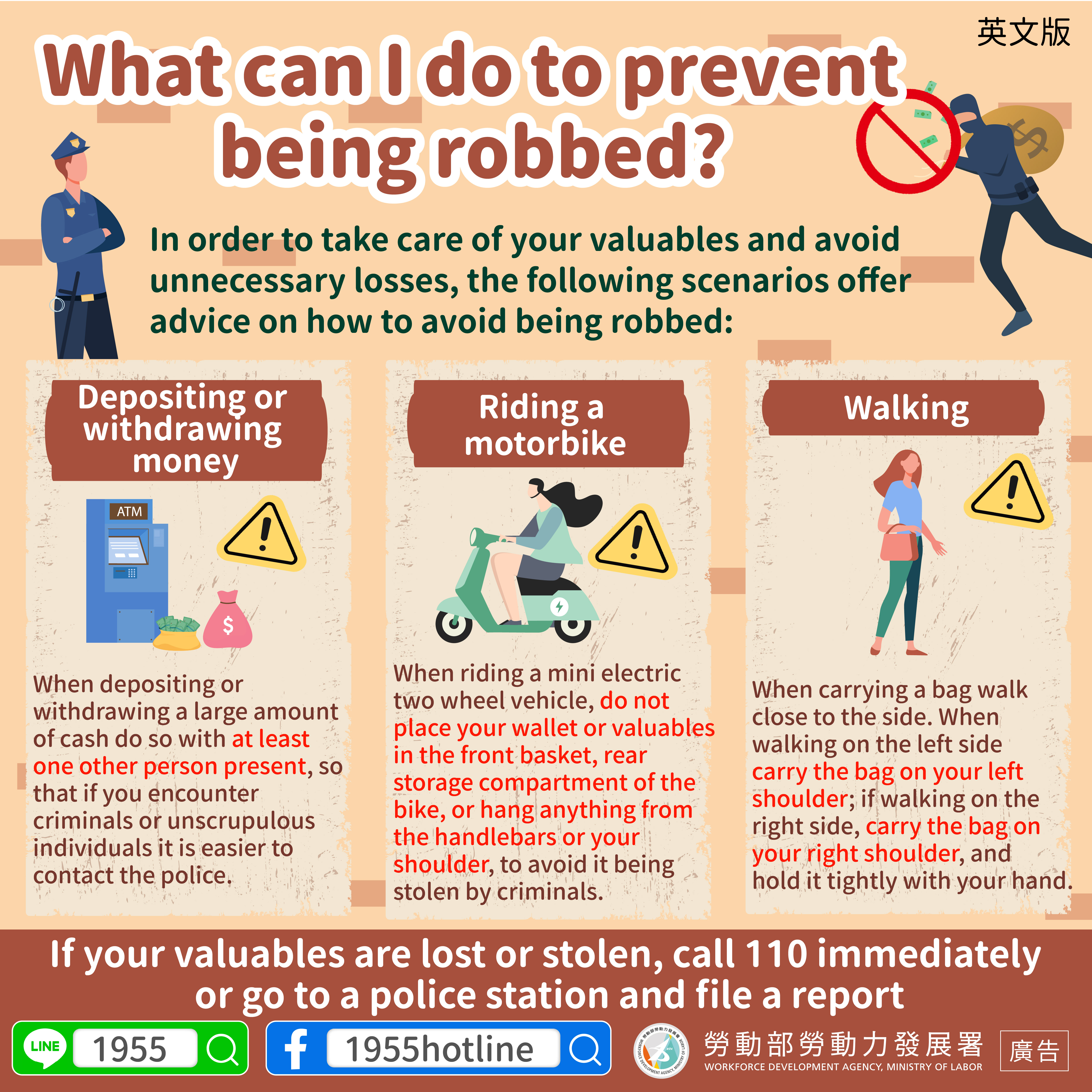 •Depositing or withdrawing money:When depositing or withdrawing a large amount of cash do so with at least one other person present, so that if you encounter criminals or unscrupulous individuals it is easier to contact the police.