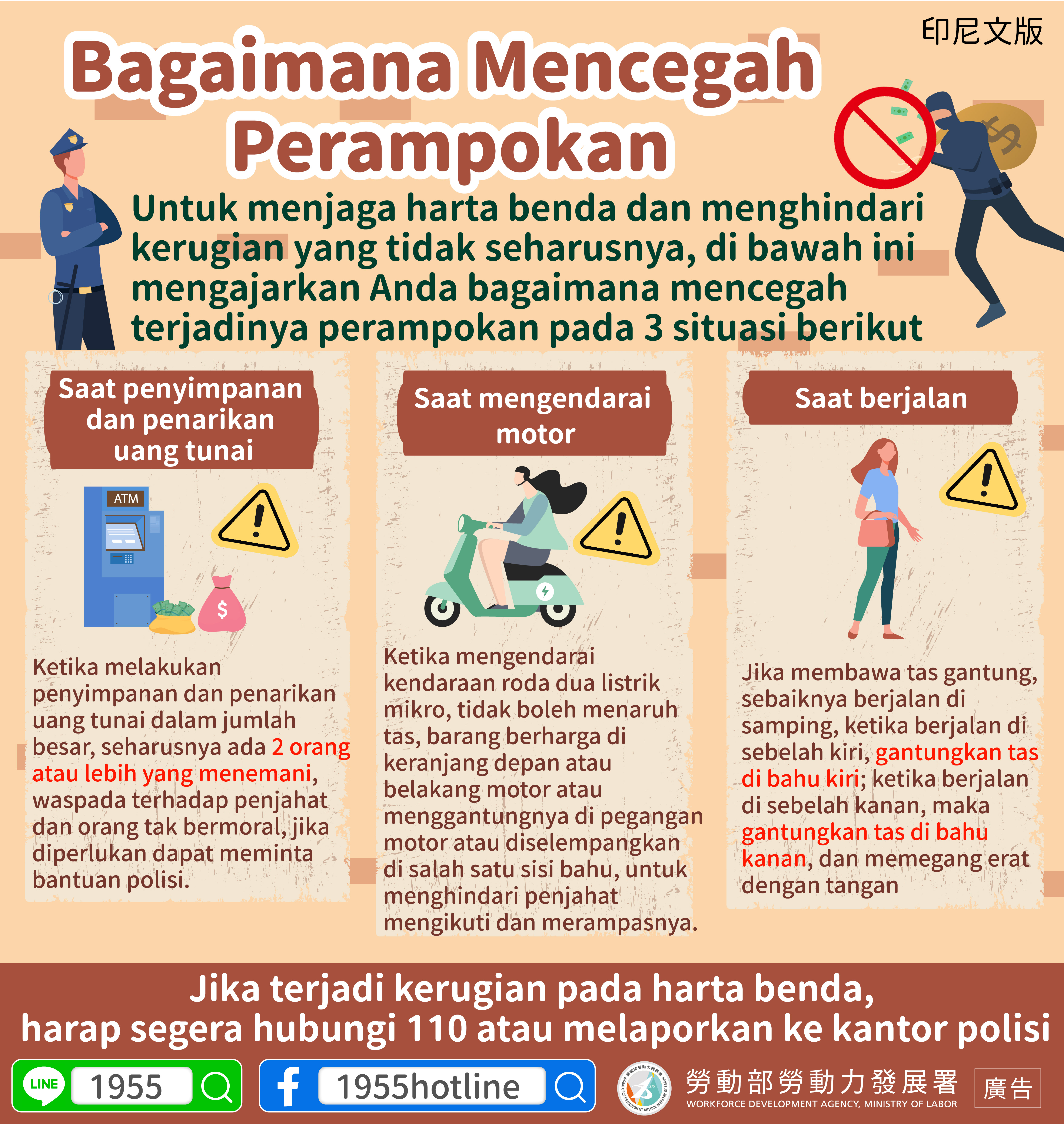 Jika terjadi kerugian pada harta benda, harap segera hubungi 110 atau melaporkan ke kantor polisi