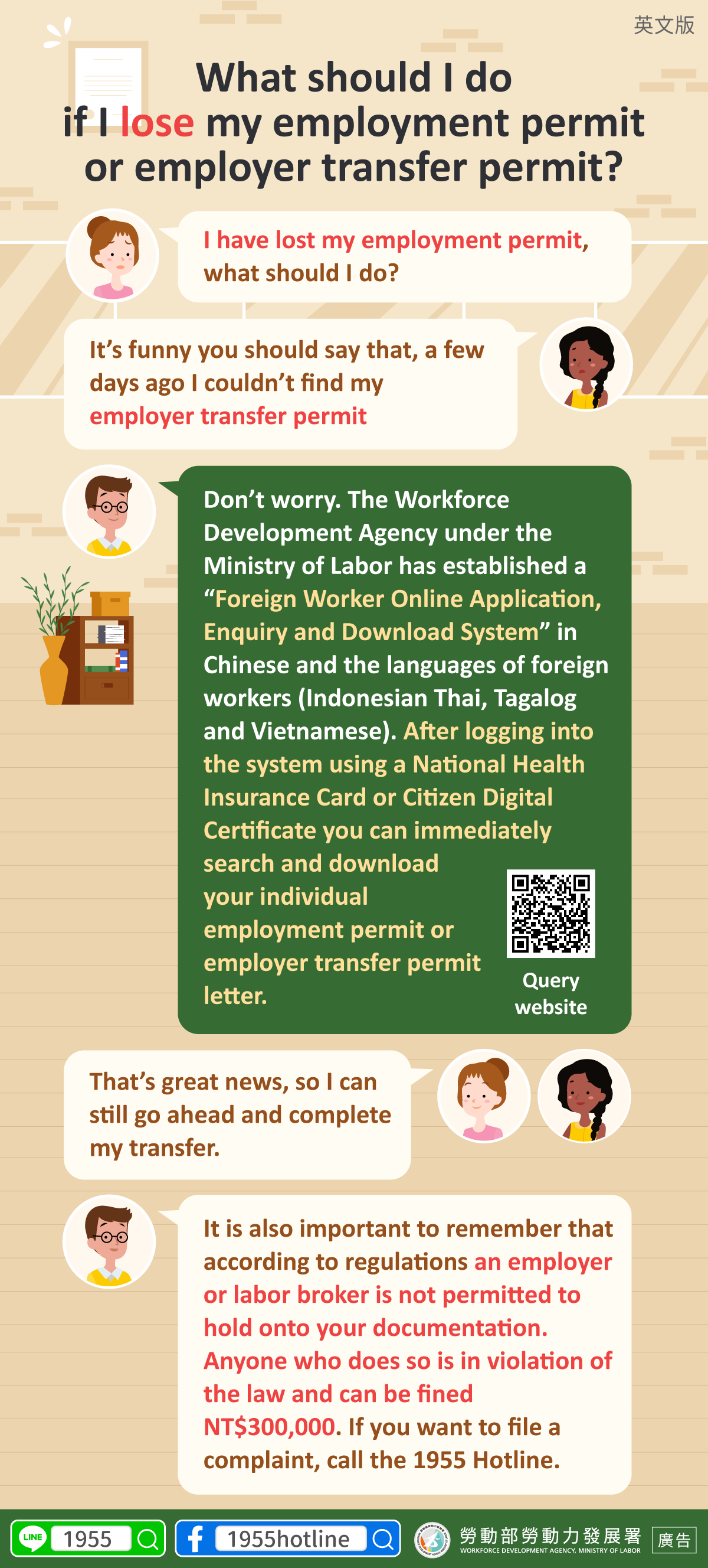 C:It is also important to remember that according to regulations an employer or labor broker is not permitted to hold onto your documentation. Anyone who does so is in violation of the law and can be fined NT$300,000. If you want to file a complaint, call the 1955 Hotline.