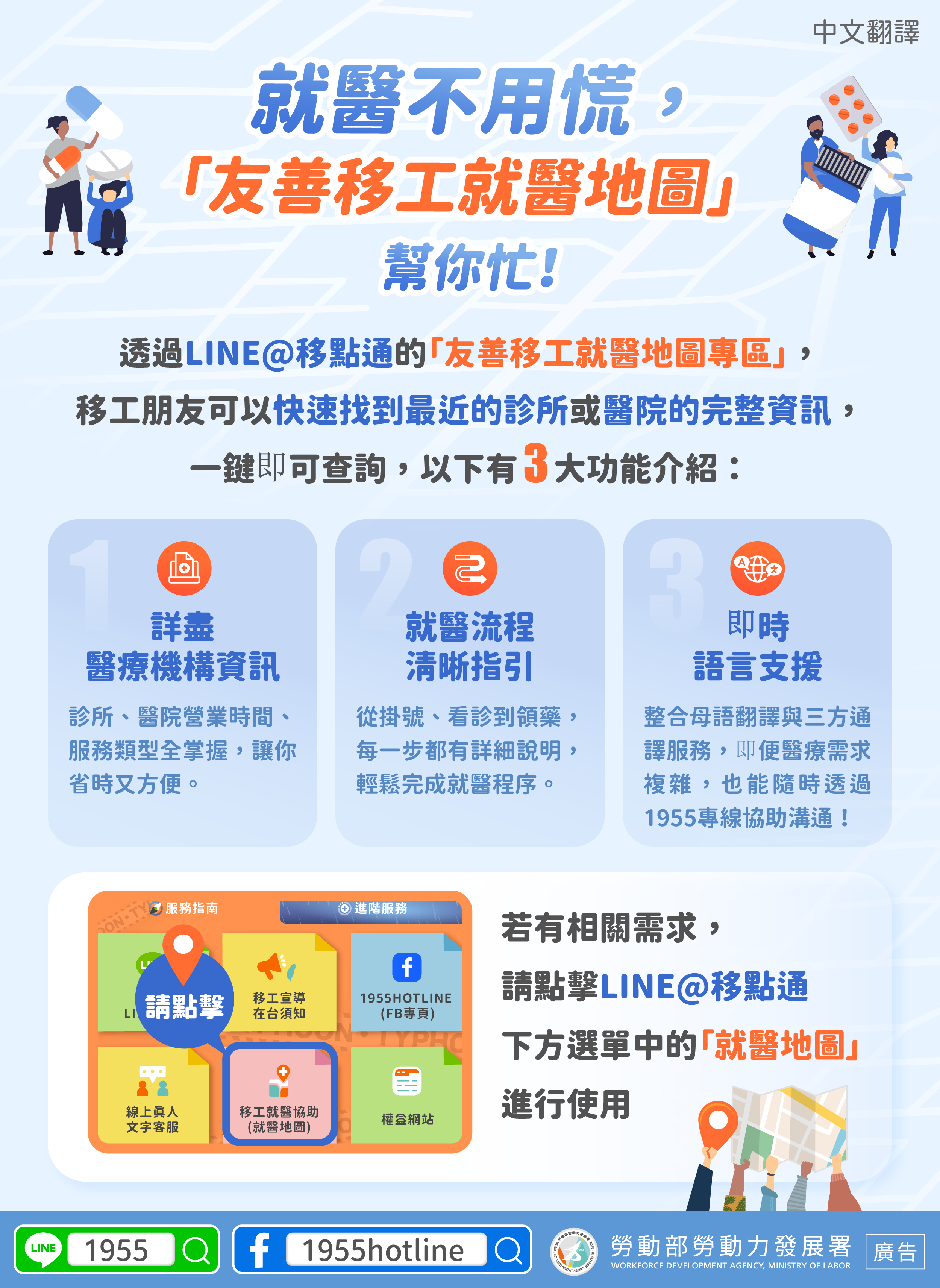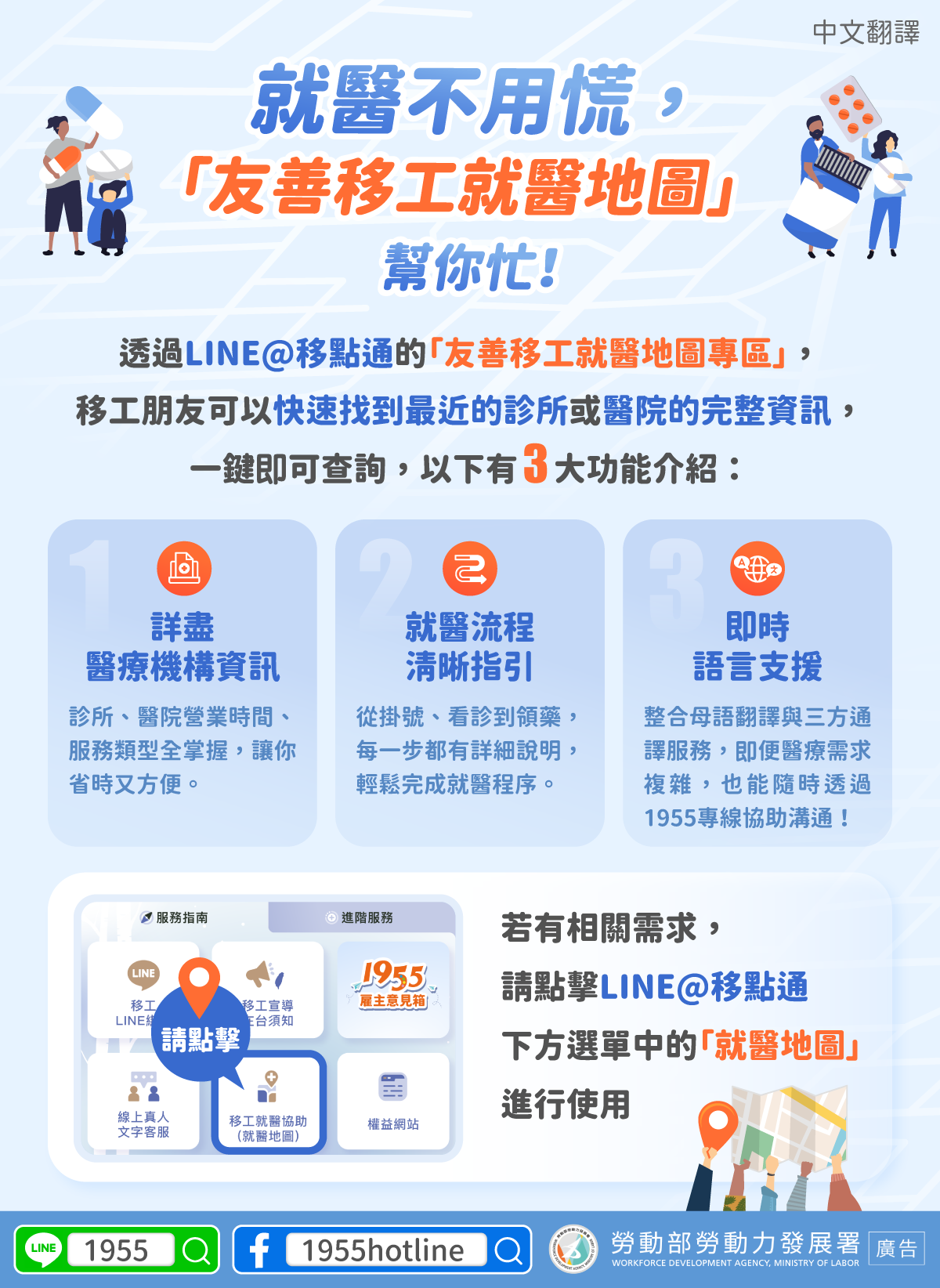3.即時語言支援:整合母語翻譯與三方通譯服務,即便醫療需求複雜,也能隨時透過1955專線協助溝通!
