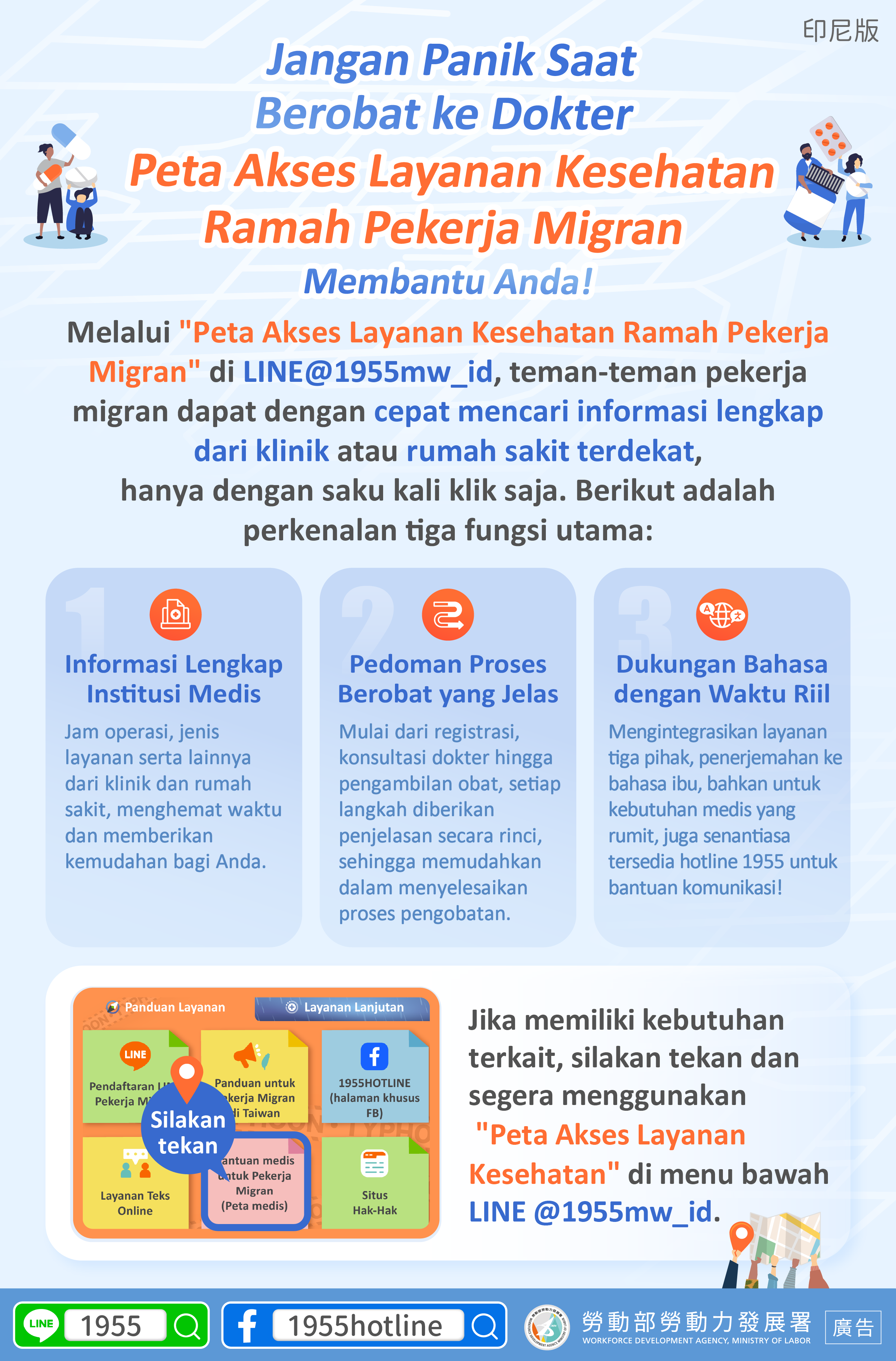 Jika memiliki kebutuhan terkait, silakan tekan dan segera menggunakan "Peta Akses Layanan Kesehatan" di menu bawah LINE @1955mw_id.