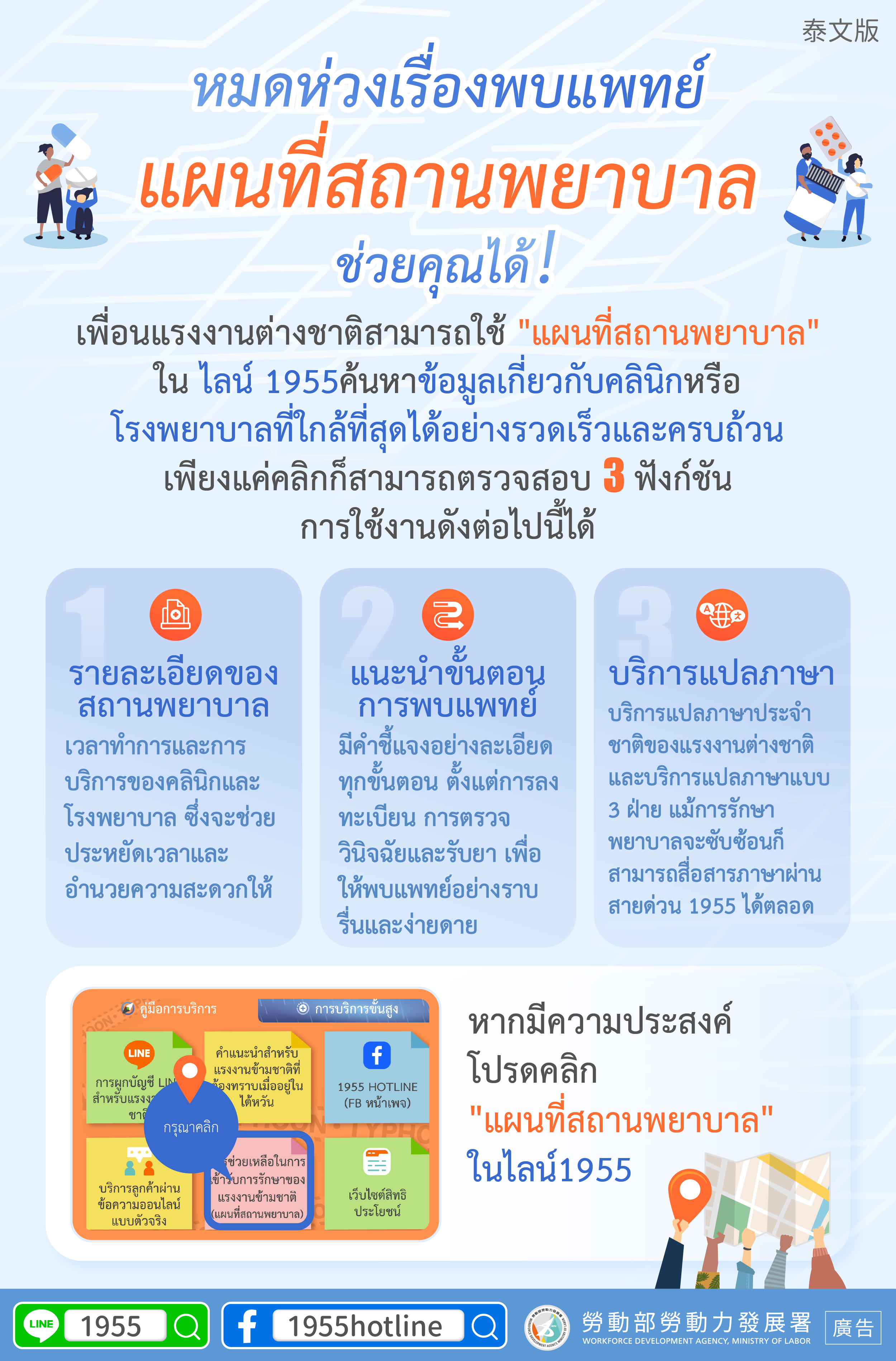 3.บริการแปลภาษา:บริการแปลภาษาประจำชาติของแรงงานต่างชาติและบริการแปลภาษาแบบ 3 ฝ่าย แม้การรักษาพยาบาลจะซับซ้อนก็สามารถสื่อสารภาษาผ่านสายด่วน 1955 ได้ตลอดเวลา !