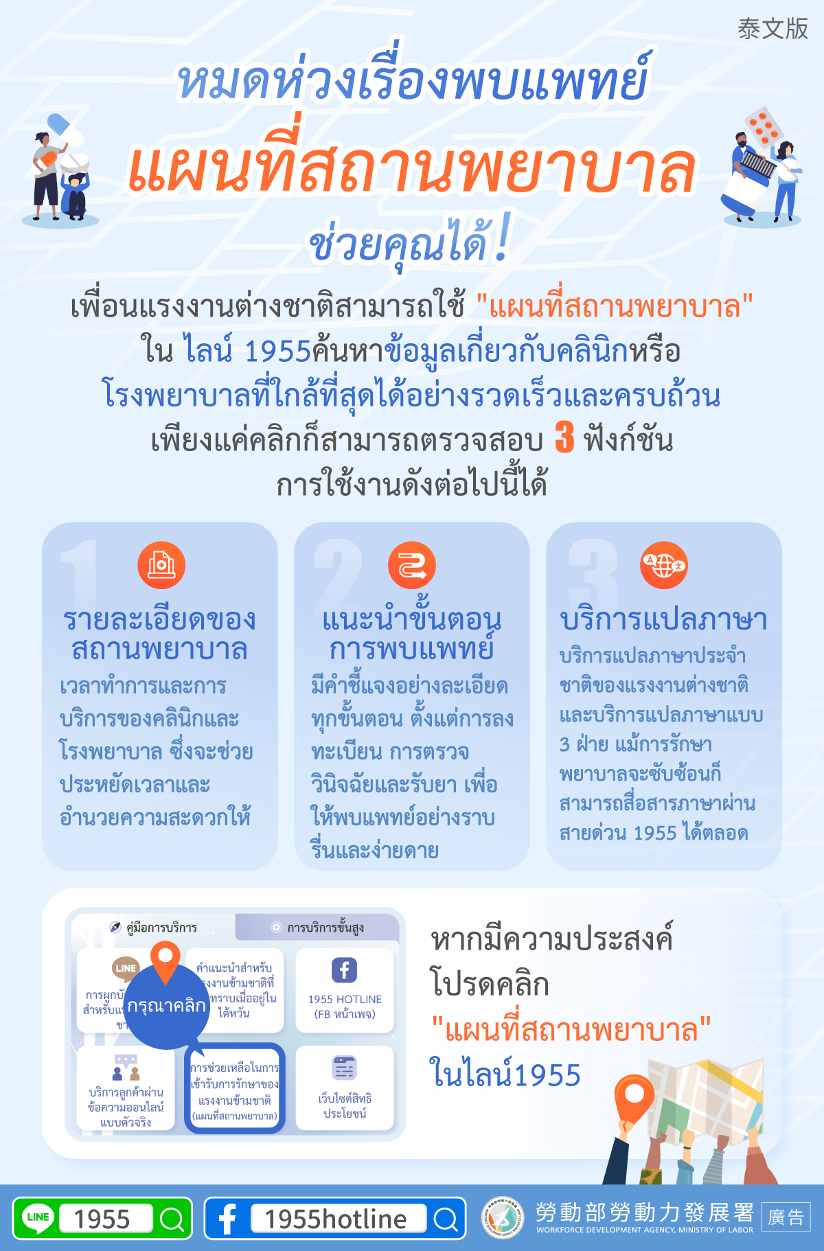 เพื่อนแรงงานต่างชาติสามารถใช้ "แผนที่สถานพยาบาล" ใน ไลน์ 1955ค้นหาข้อมูลเกี่ยวกับคลินิกหรือโรงพยาบาลที่ใกล้ที่สุดได้อย่างรวดเร็วและครบถ้วนเพียงแค่คลิกก็สามารถตรวจสอบ 3 ฟังก์ชันการใช้งานดังต่อไปนี้ได้