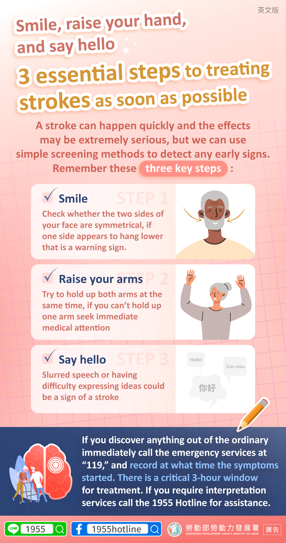 If you discover anything out of the ordinary immediately call the emergency services at “119,” and record at what time the symptoms started. There is a critical 3-hour windowfor treatment. If you require interpretation services call the 1955 Hotline for assistance.