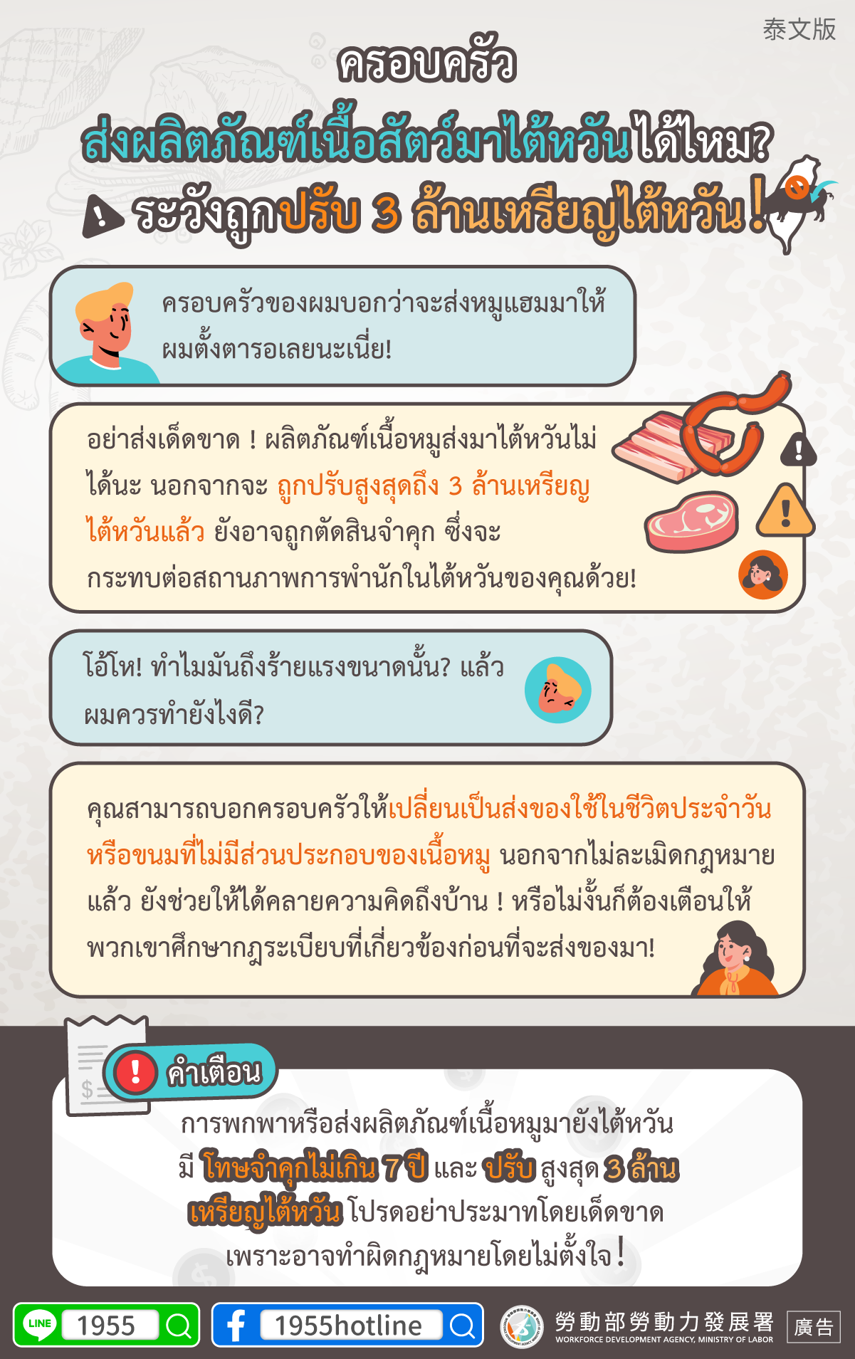 การพกพาหรือส่งผลิตภัณฑ์เนื้อหมูมายังไต้หวันมีโทษจำคุกไม่เกิน 7 ปีและปรับสูงสุด 3 ล้านเหรียญไต้หวัน โปรดอย่าประมาทโดยเด็ดขาดเพราะอาจทำผิดกฎหมายโดยไม่ตั้งใจ!