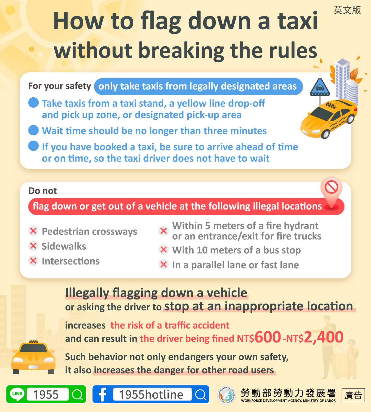 Illegally flagging down a vehicleor asking the driver to stop at an inappropriate location increases the risk of a traffic accidentand can result in the driver being fined NT$600 -NT$2,400