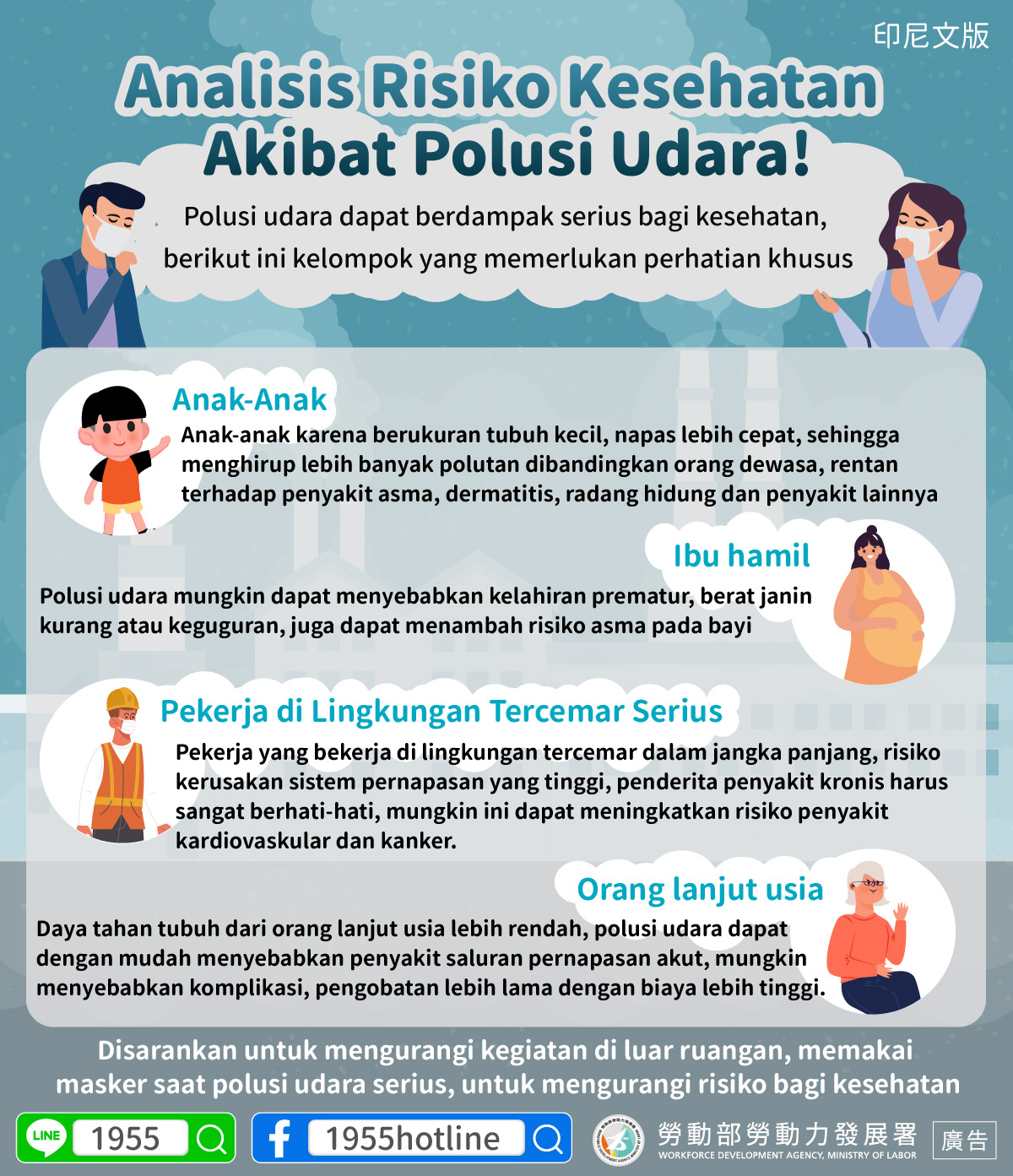 Ibu hamil:Polusi udara mungkin dapat menyebabkan kelahiran prematur, berat janin kurang atau keguguran, juga dapat menambah risiko asma pada bayi