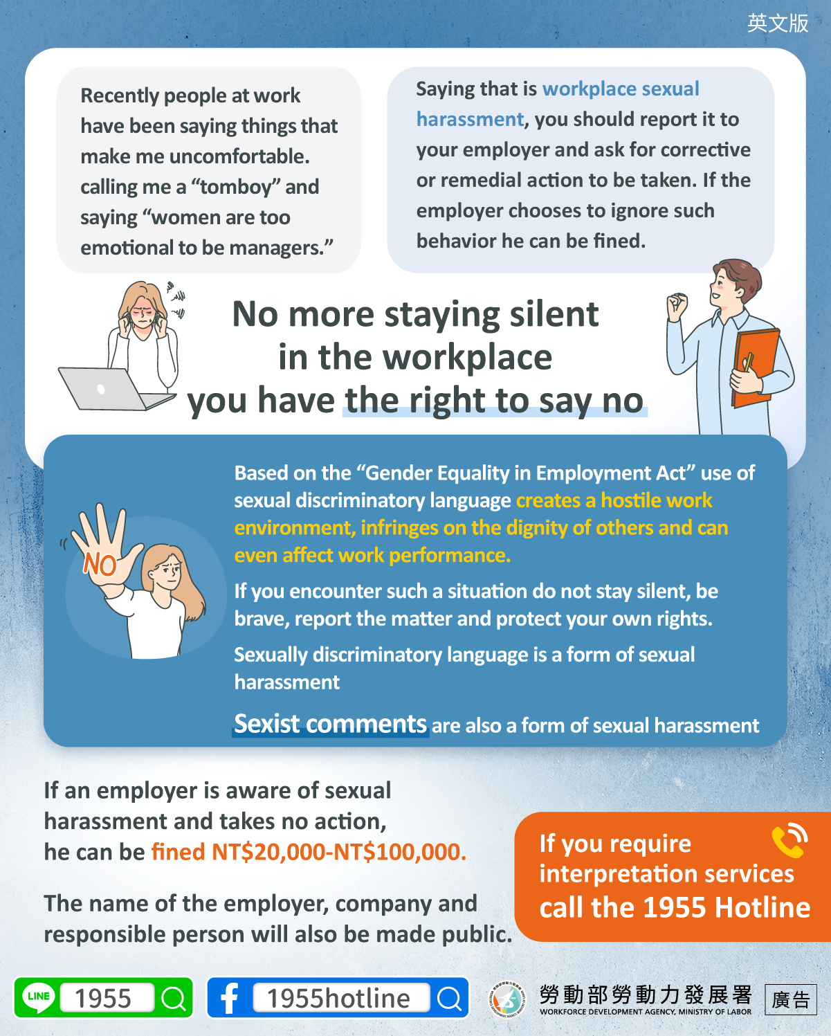 If an employer is aware of sexual harassment and takes no action,he can be fined NT$20,000-NT$100,000.