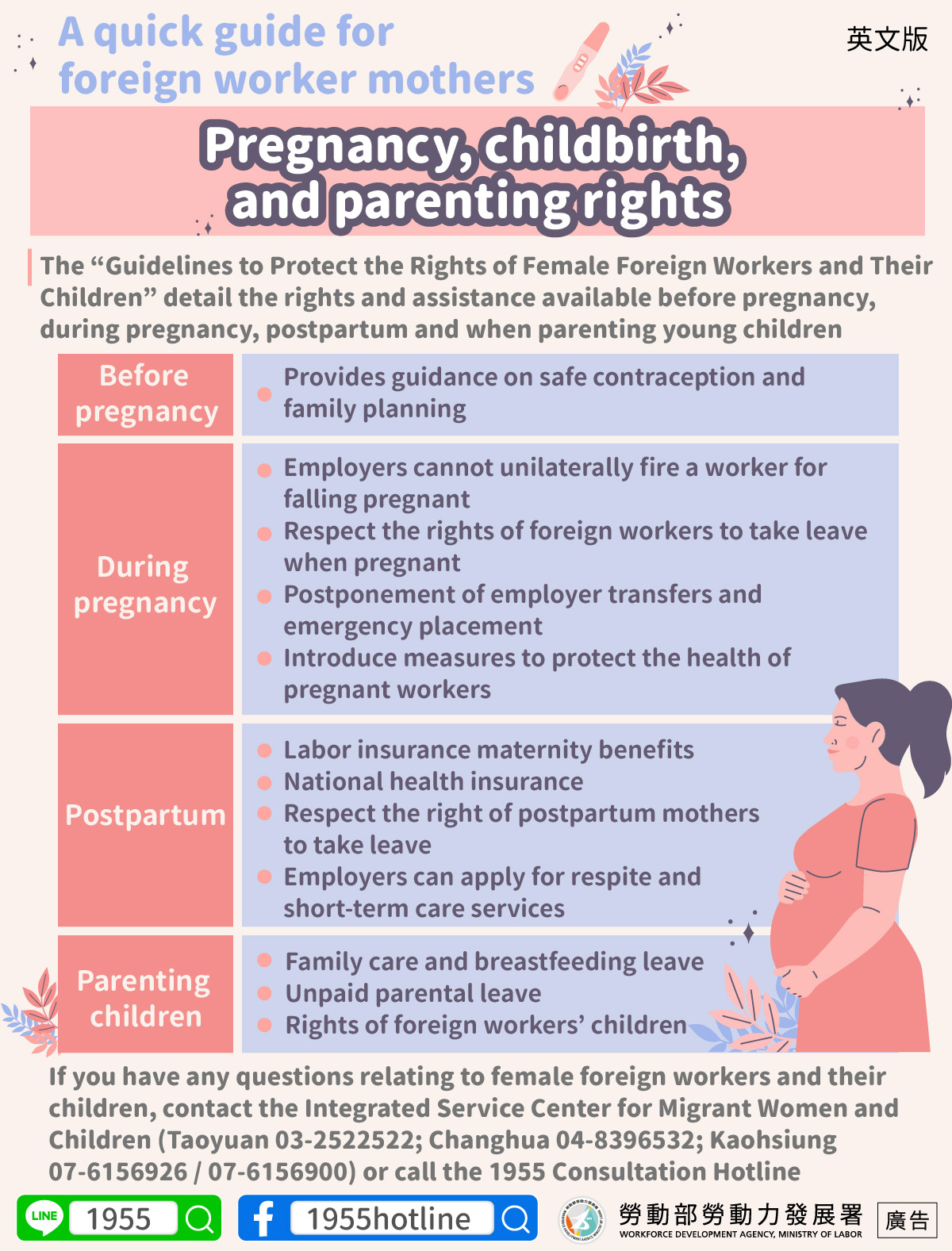 The “Guidelines to Protect the Rights of Female Foreign Workers and Their Children” detail the rights and assistance available before pregnancy, during pregnancy, postpartum and when parenting young children