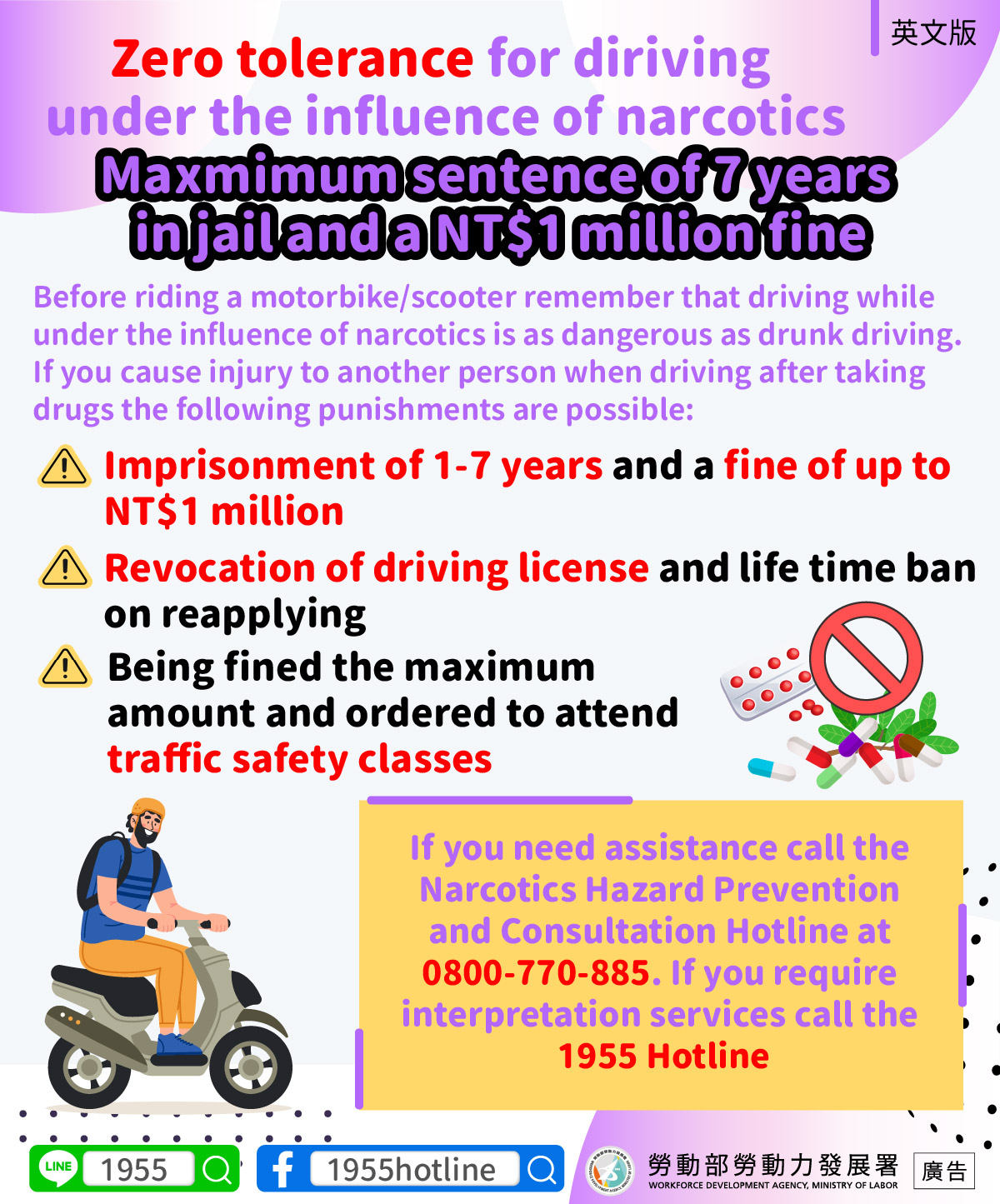 ▍Zero tolerance for diriving under the influence of narcotics Maxmimum sentence of 7 years in jail and a NT$1 million fine