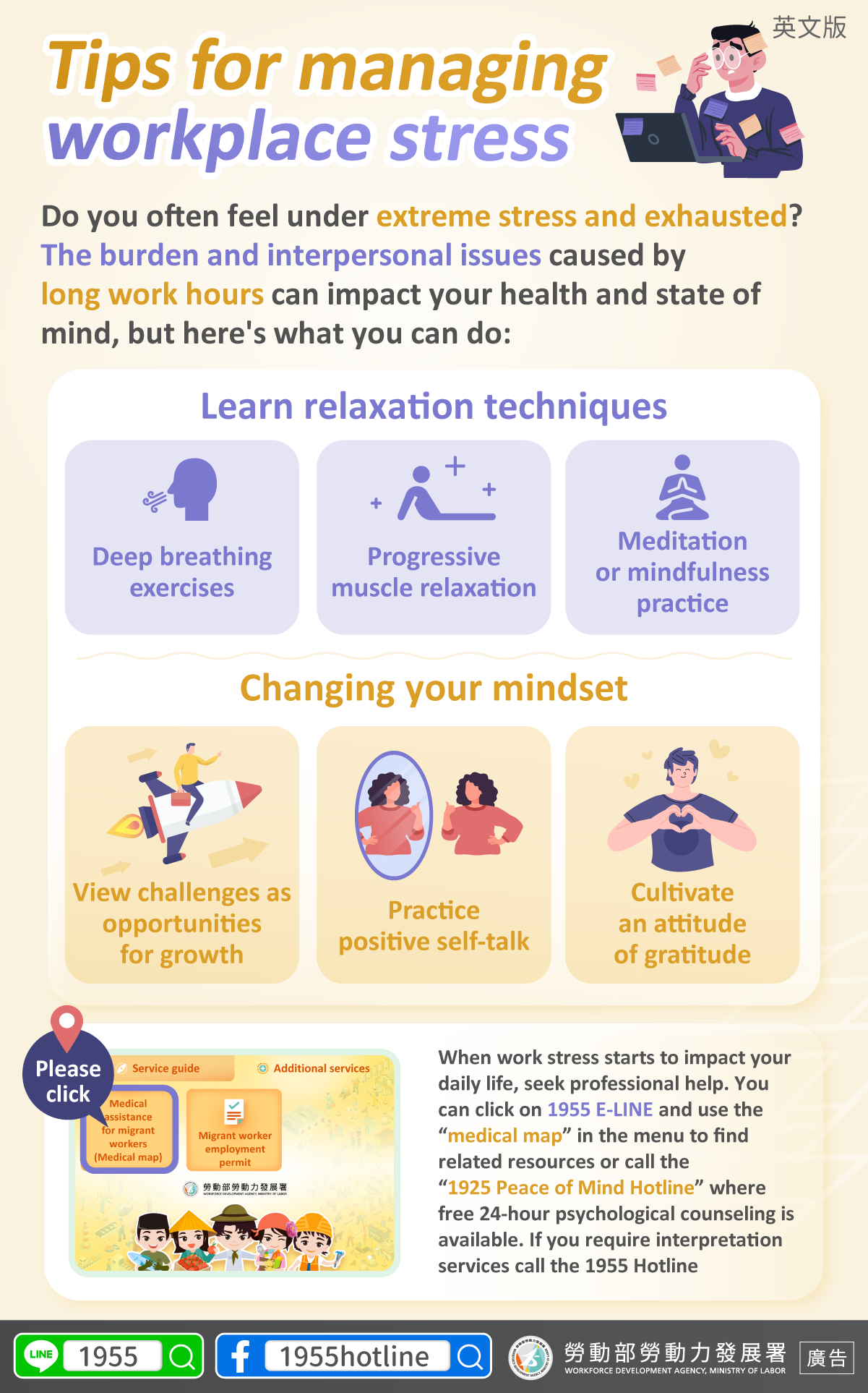 When work stress starts to impact your daily life, seek professional help. You can click on 1955 E-LINE and use the “medical map” in the menu to find related resources or call the“1925 Peace of Mind Hotline” where free 24-hour psychological counseling is available. If you require interpretation services call the 1955 Hotline