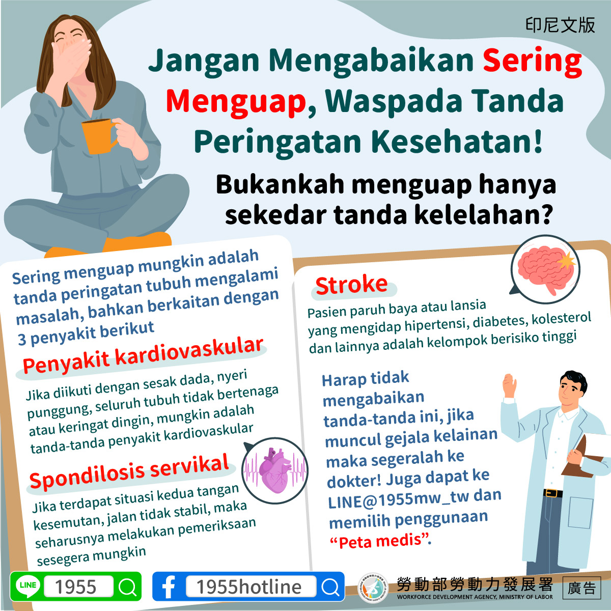 Harap tidak mengabaikan tanda-tanda ini, jika muncul gejala kelainan maka segeralah ke dokter! Juga dapat ke LINE@1955mw_tw dan memilih penggunaan “Peta medis”.